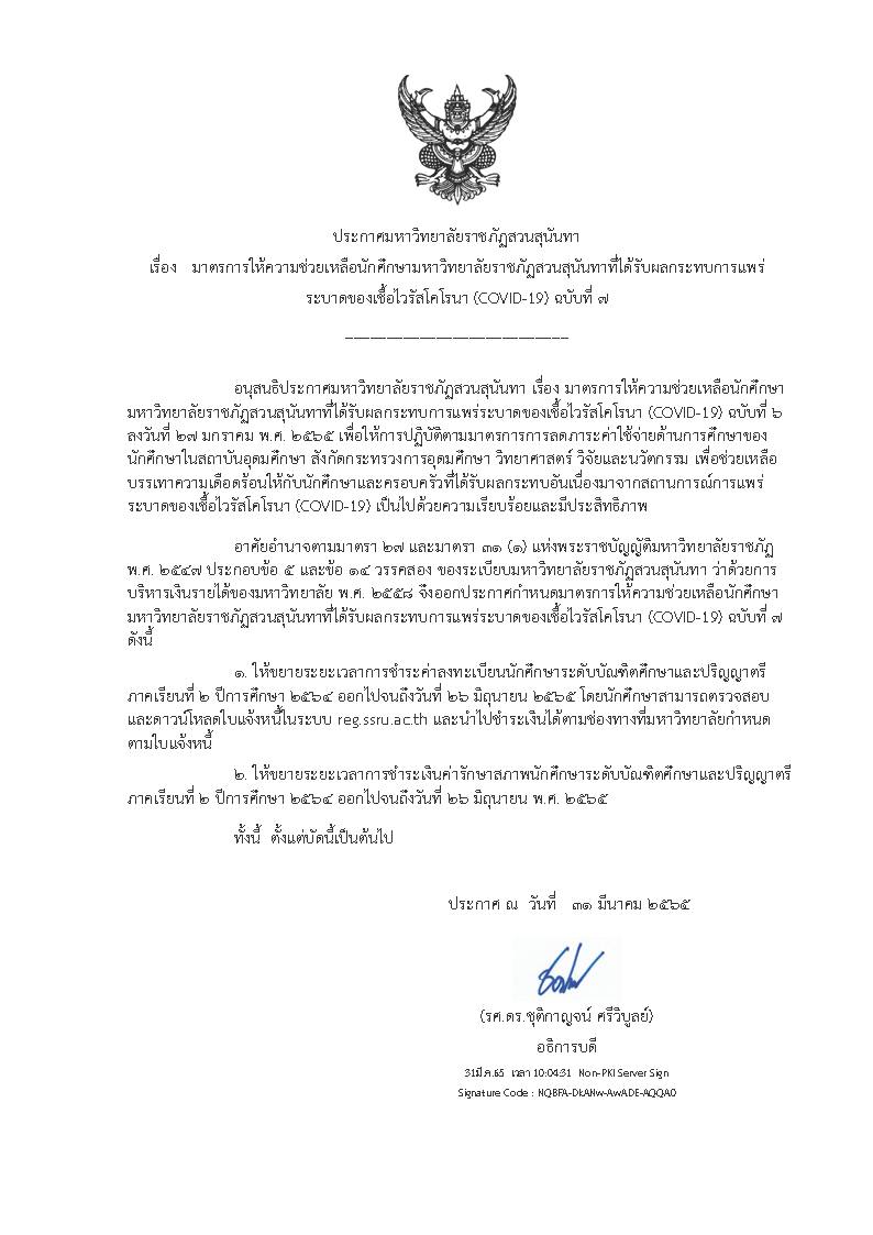 **ประกาศมหาวิทยาลัยราชภัฏสวนสุนันทา เรื่อง มาตรการให้ความช่วยเหลือนักศึกษามหาวิทยาลัยราชภัฏสวนสุนันทาที่ได้รับผลกระทบการแพร่ระบาดของเชื้อไวรัสโคโรนา (CODIV-19) ฉบับที่ 7