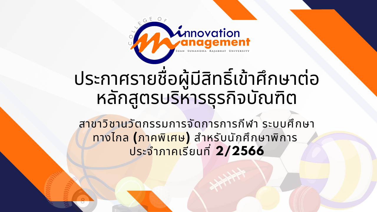 ประกาศรายชื่อผู้มีสิทธิ์เข้าศึกษาต่อ หลักสูตรบริหารธุรกิจบัณฑิต สาขาวิชานวัตกรรมการจัดการการกีฬา ระบบศึกษาทางไกล (ภาคพิเศษ) สำหรับนักศึกษาพิการ ประจำภาคเรียนที่ 2/2566