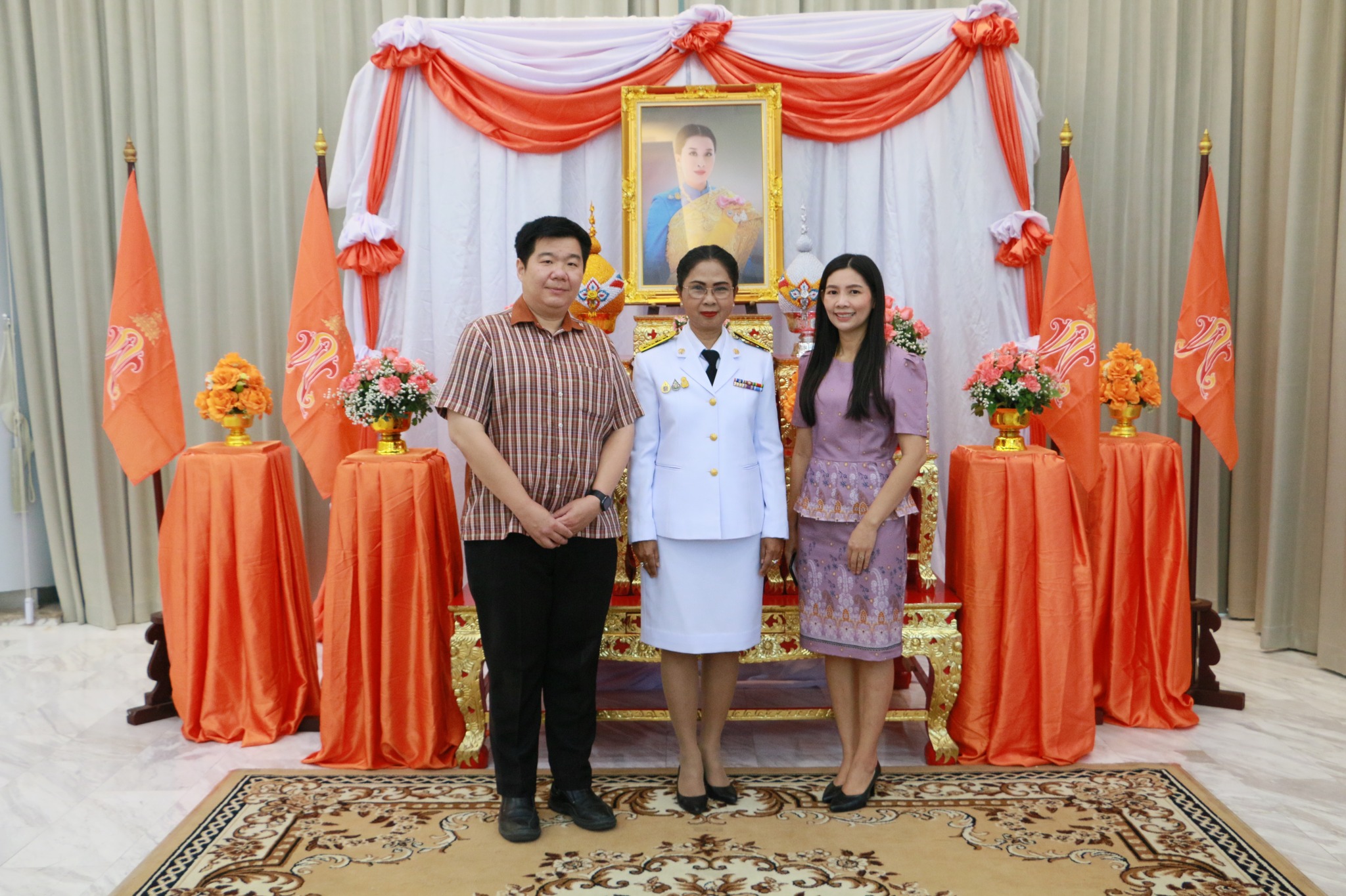 Friday, December 16, 2022, 8:15 a.m. Assistant Professor Dr. Chonlapasorn Sitthiwarongchai, Dean of the College of Innovation and Management assigned Dr. Sakul Jariyachamsit Deputy Dean for Quality Assurance and Special Affairs together with Ms. Namthip Kleebbuaban, the head of the office Attended the blessing ceremony for Her Royal Highness Princess Maha Chakri Sirindhorn Prince Patcharakitiyabha Narendira Thep Yowadee Kromluang Rat Associate Professor Dr. Nantiya Noichan, Vice President for Academic Affairs at Suan Sunandha Rajabhat University, presided over the ceremony with dignity. In front of His Majesty the King's portrait, a cone of flowers is opened to pay homage, offering flower.