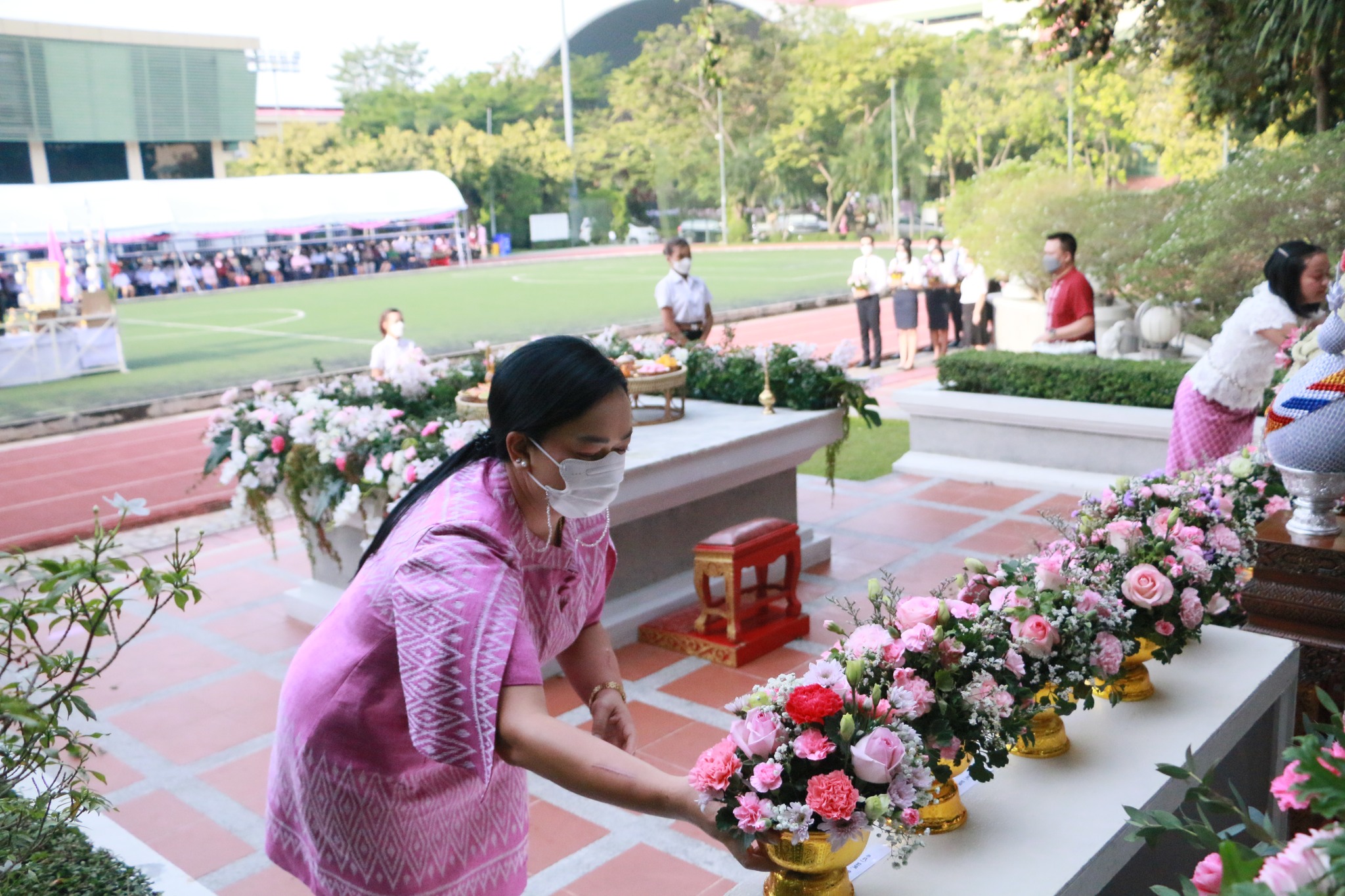 7.15 a.m. Associate Professor Dr. Ruedech Kerdwichai, President of the University Council, and Associate Professor Dr. Chutikarn Sriwiboon, President of the Suan Sunandha Alumni Association, both under Royal Patronage Satit School Alumni Association President, administrators, faculty members, and student representatives Students constructing altars to pay homage