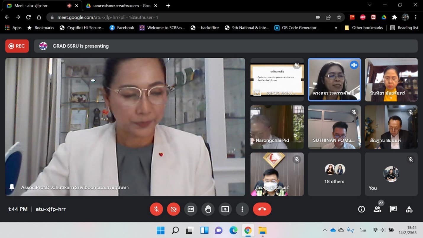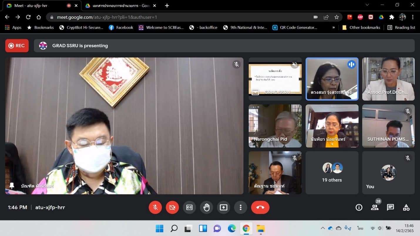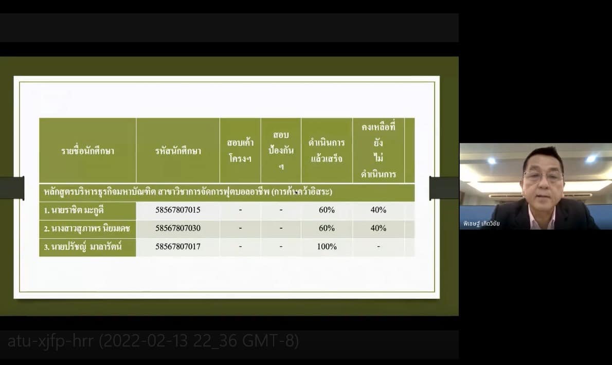 On February 16, 2020, from 1:30 p.m. - 4:00 p.m., a college graduate meeting was organized by Dr. Pichet Kerdwichai, President of the Master of Management Program. Professional Football Management Program participated in the presentation of Agenda 6.2 . To extend the period of study for (additional) 3 students . Through the Zoom Meeting program.