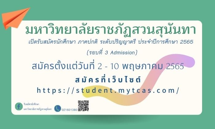 Suan Sunandha Rajabhat University .Open for enrollment of students in regular semester, bachelor's degree. Academic Year 2022 (Round 3 Admission)