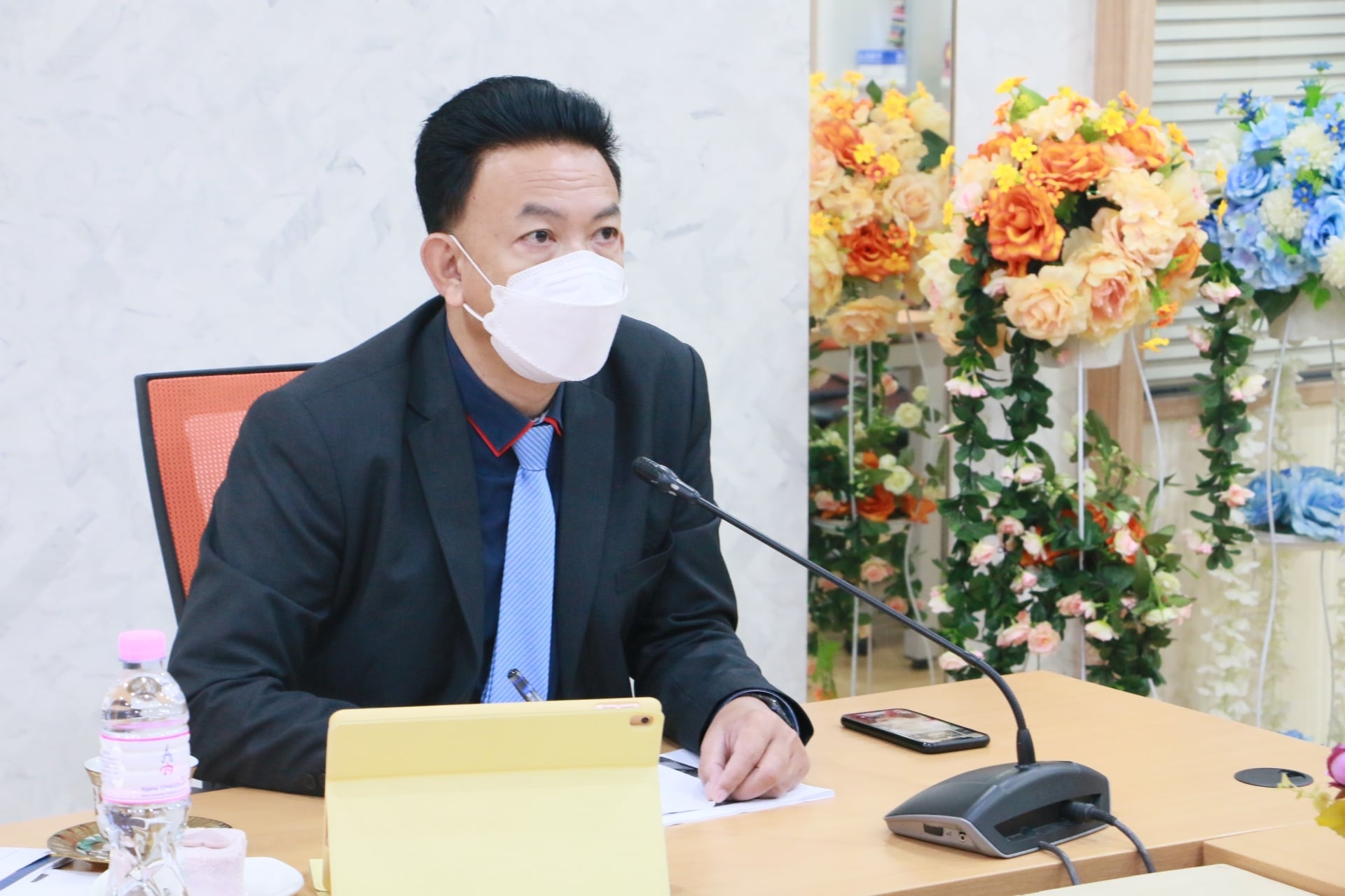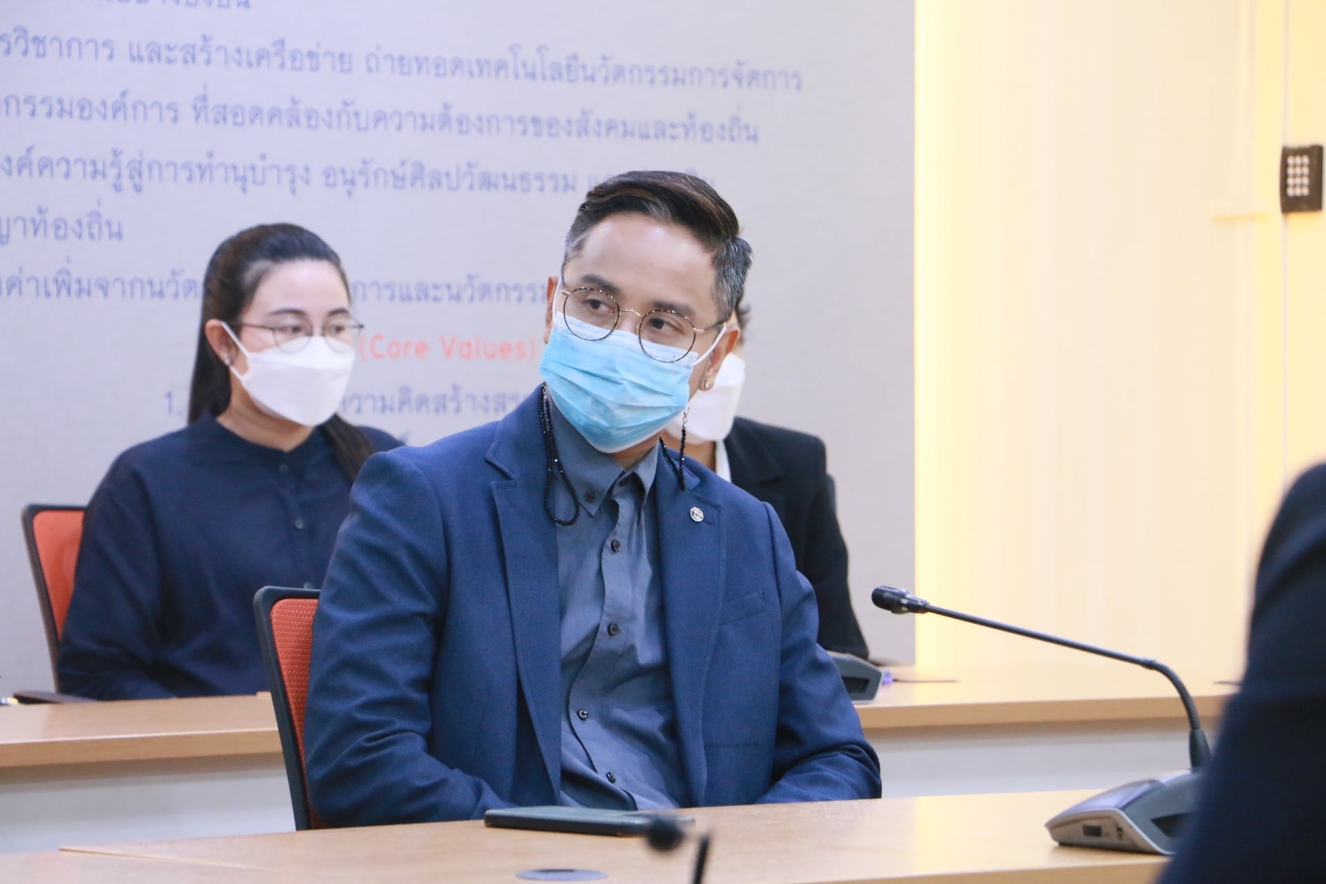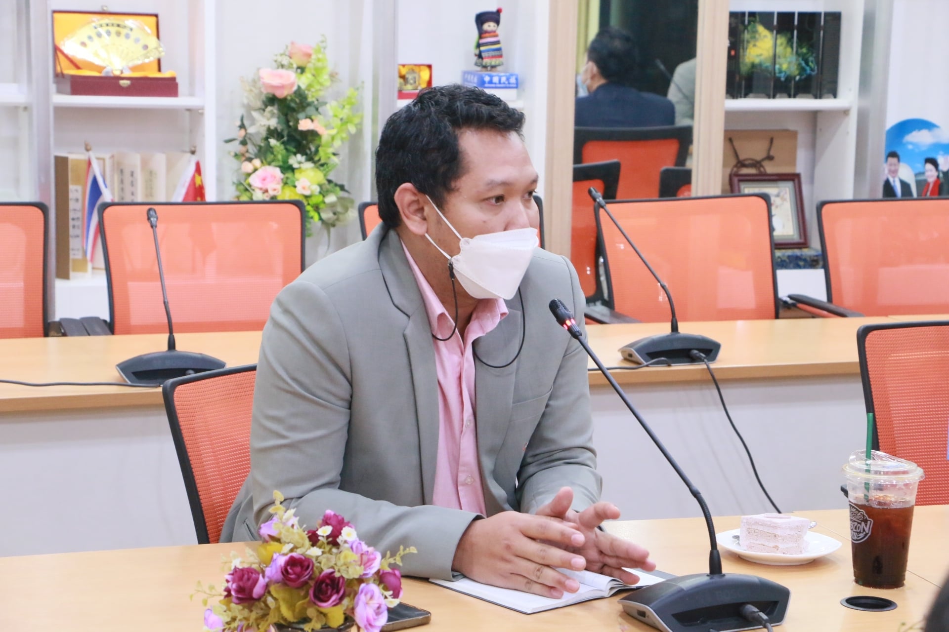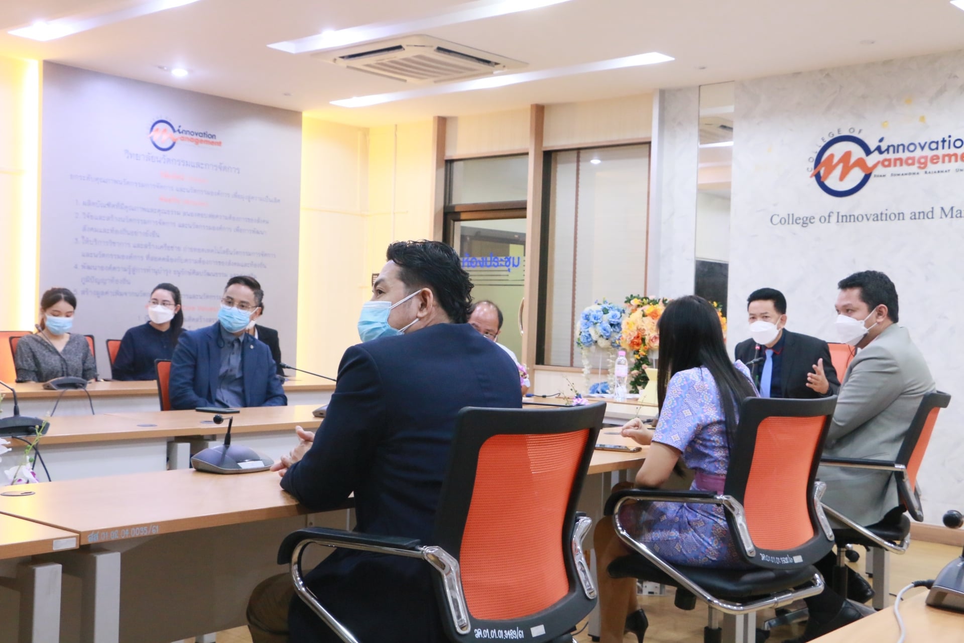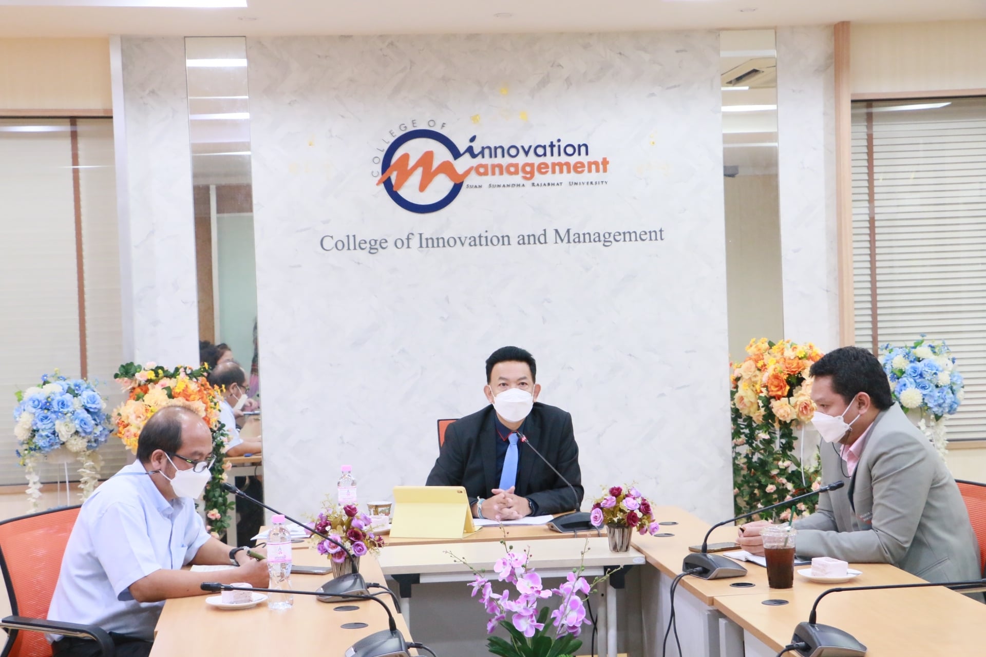 Friday 17 September 2021 College of Innovation and Management open house assistant professor Dr. Jetsarit Angsukatchjanakul Vice Rector for Student Affairs.In the activity "Vice President for Student Affairs for roaming" Asst. Prof. Dr. Phattawit Yuwattana, Deputy Dean for Student Affairs, joined the reception.with executives, faculty and staff at the College of Innovation and Management Conference Room and via online Zoom meeting