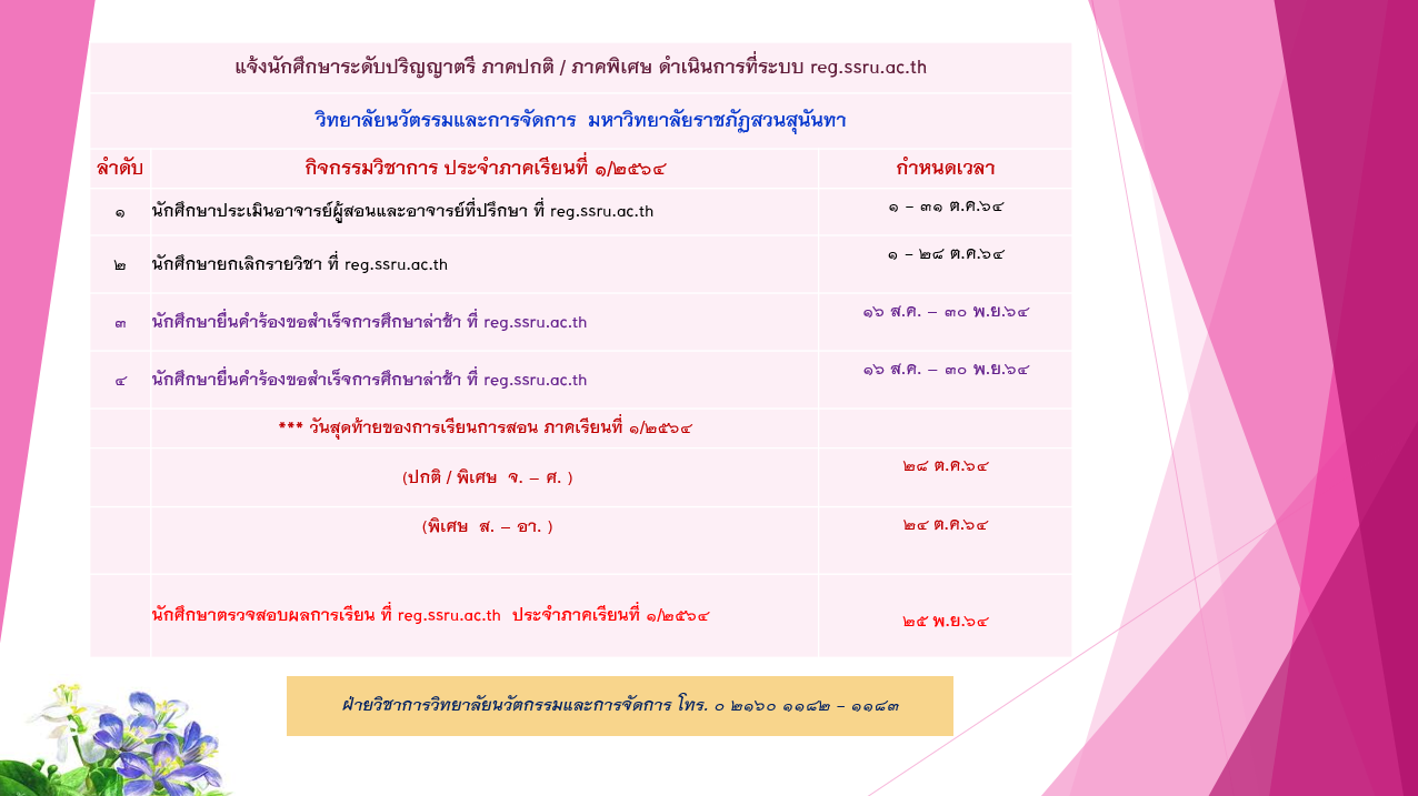 Inform undergraduate students regular / special program College of Innovation and Management at reg.ssru.ac.th for semester 1/2021 as follows