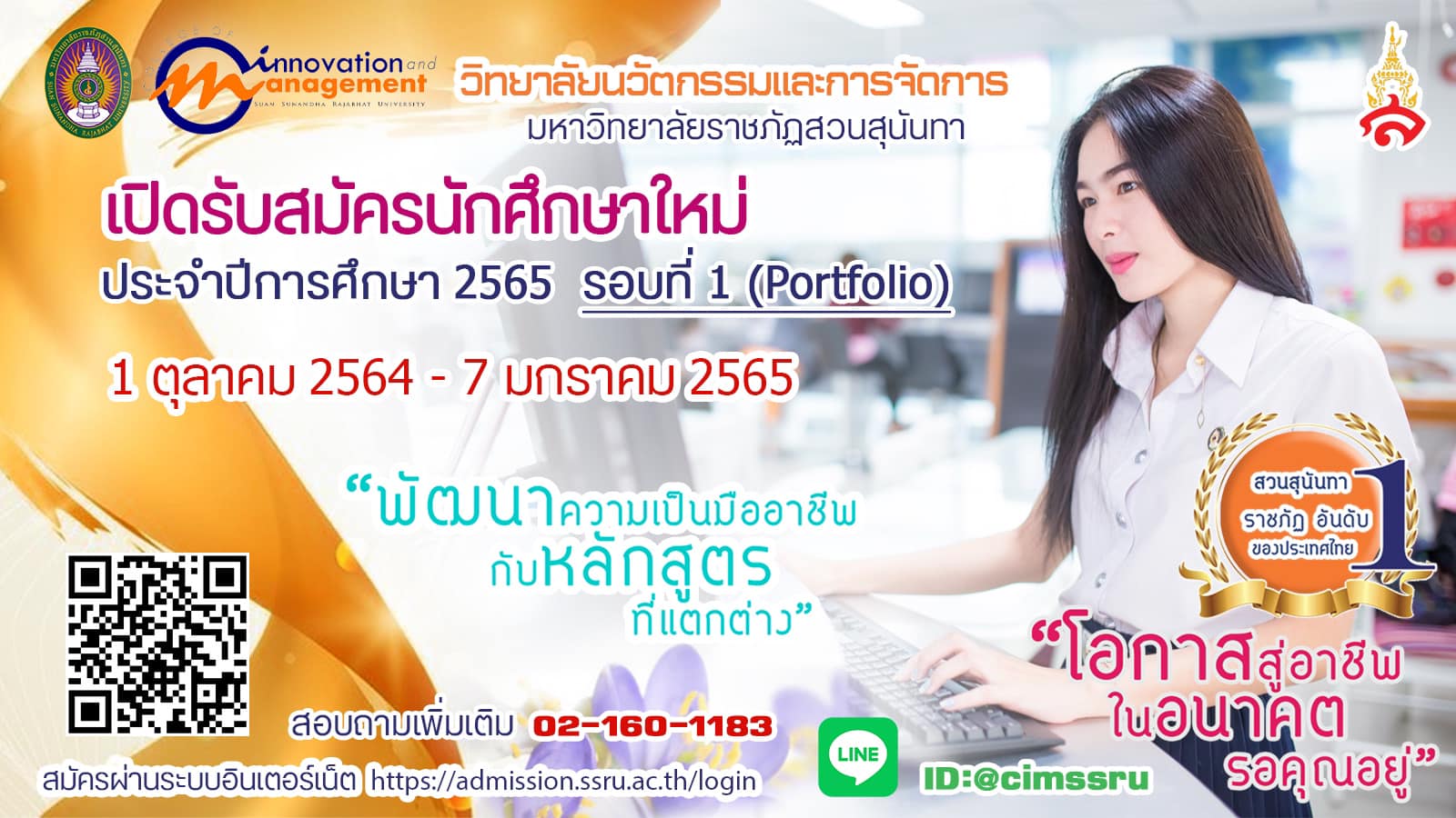 Suan Sunandha Rajabhat University Open to recruit students for regular semester, bachelor's degree Academic Year 2022 (Round 1 Portfolio) Interested applicants can apply at https://admission.ssru.ac.th/login