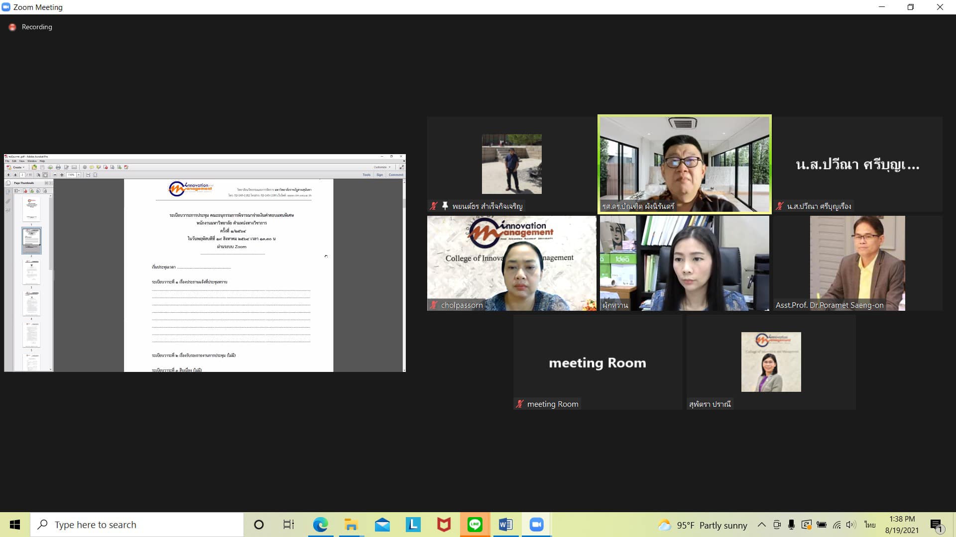 August 19, 2021 Time College of Innovation and Management organizes a meeting of the Sub-Committee to consider the payment of special compensation for university employees. Assoc.Prof.Dr.Bundit Pungnirund, Dean of the College of Innovation and Management chair the meeting via online Zoom meeting