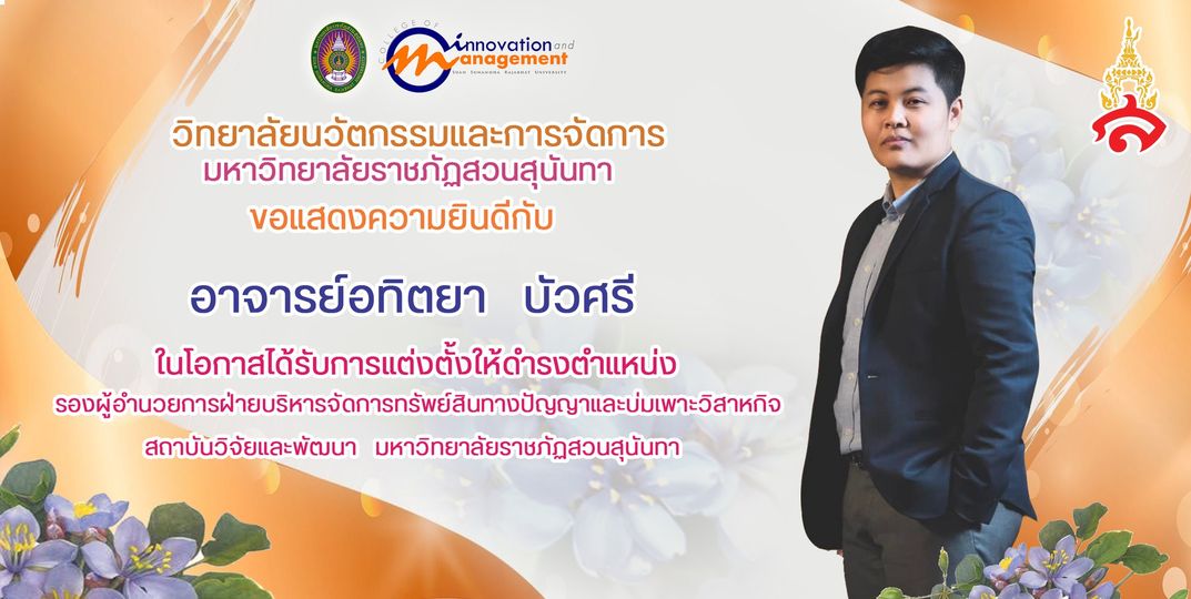 College of Innovation and Management Congratulations to Professor Aditya Buasri on the occasion of being appointed to the position "Deputy Director of Intellectual Property Management and Enterprise Incubation" Research and Development Institute Suan Sunandha Rajabhat University.