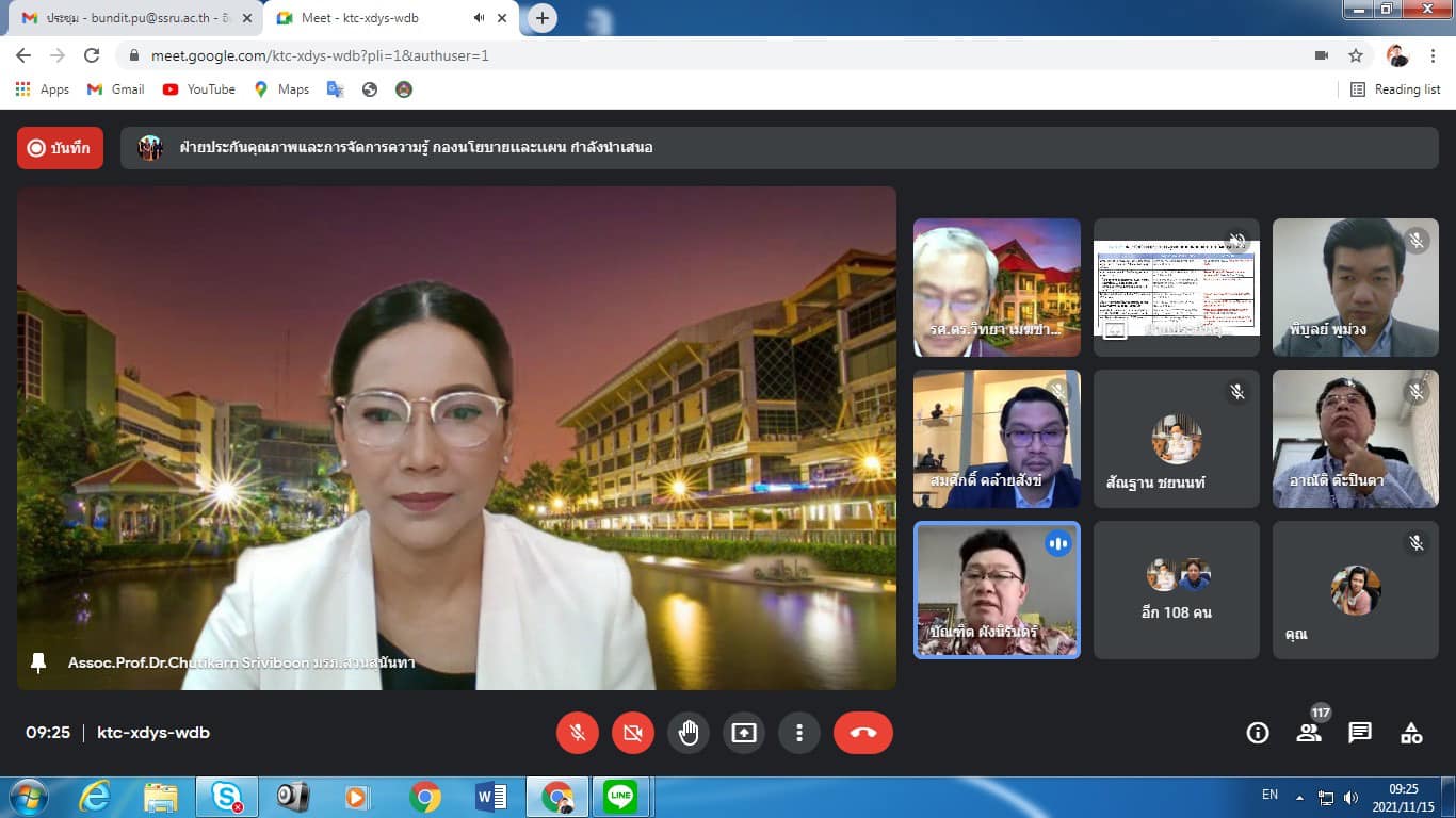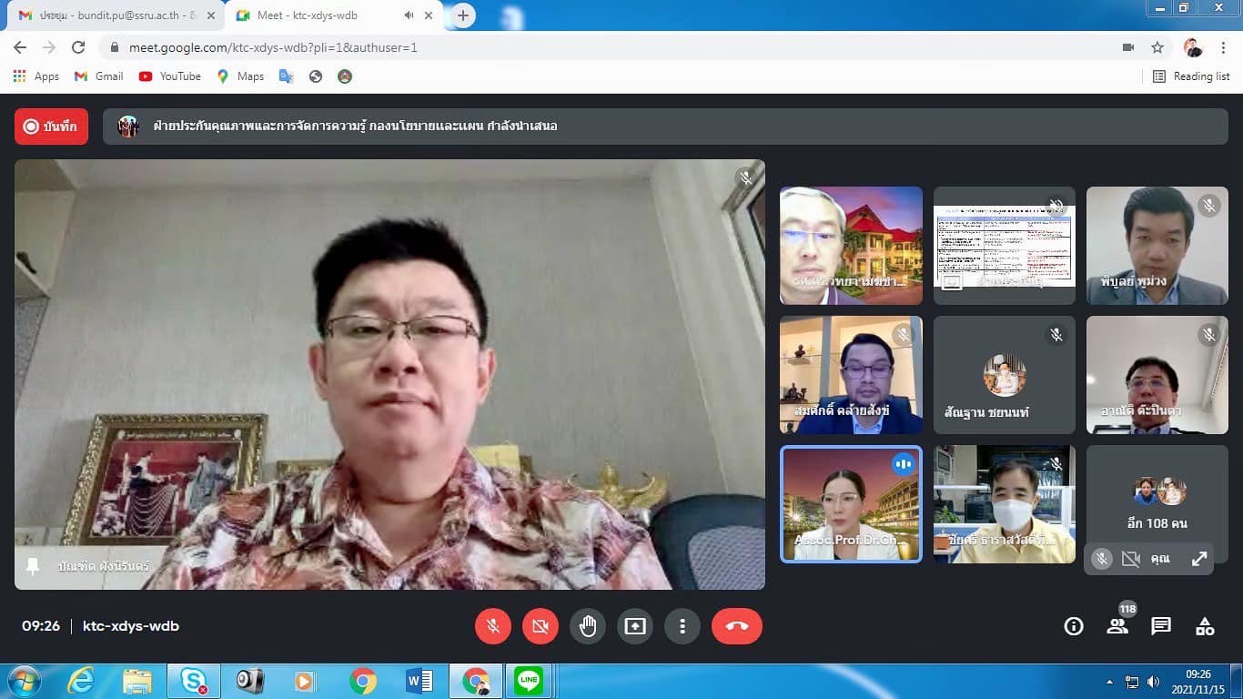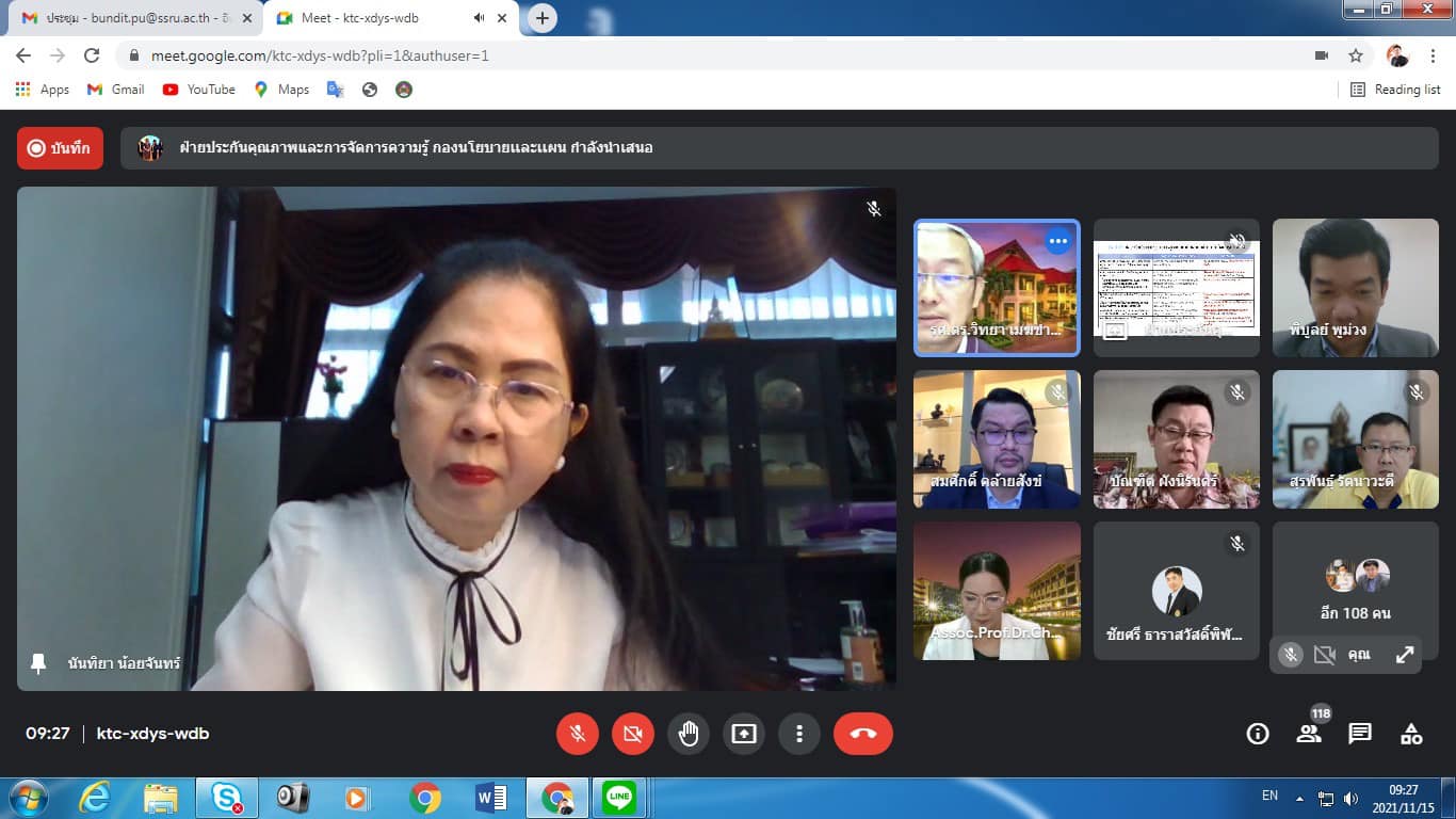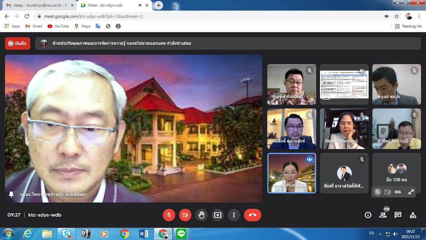 Monday, November 15, 2021 at 9:00 a.m. Assoc.Prof.Dr.Bundit Pungnirund, Dean of the College of Innovation and Management Attend the Quality Development Committee meeting Suan Sunandha Rajabhat University. For the academic year 2021 No. 1/2564, with Assoc.Prof.Dr.Chutikarn Sriviboon, President, as the chairman via the online meeting system, Google Meet program
