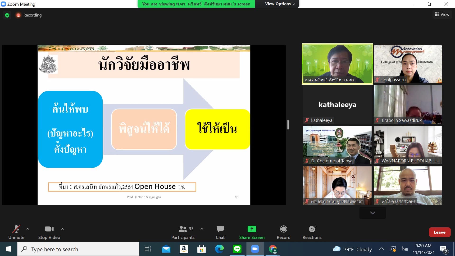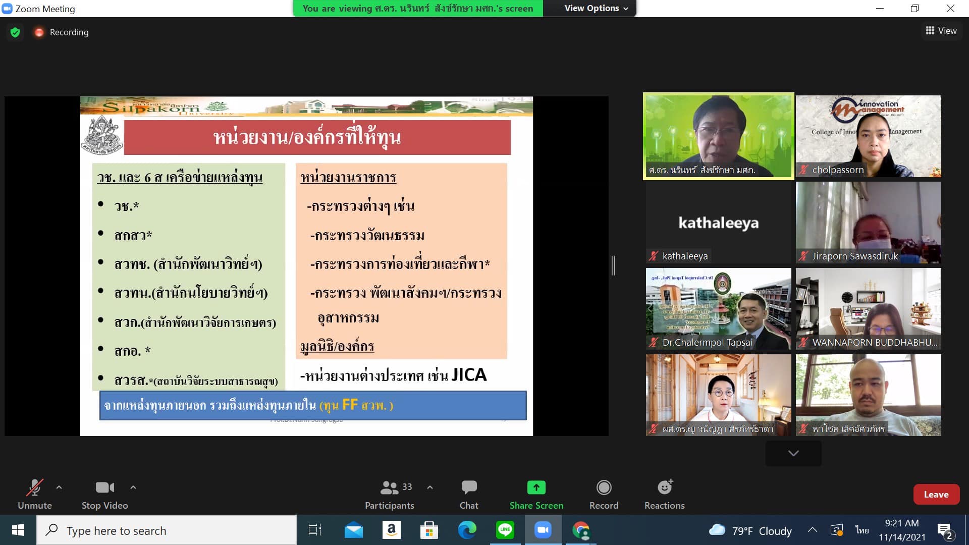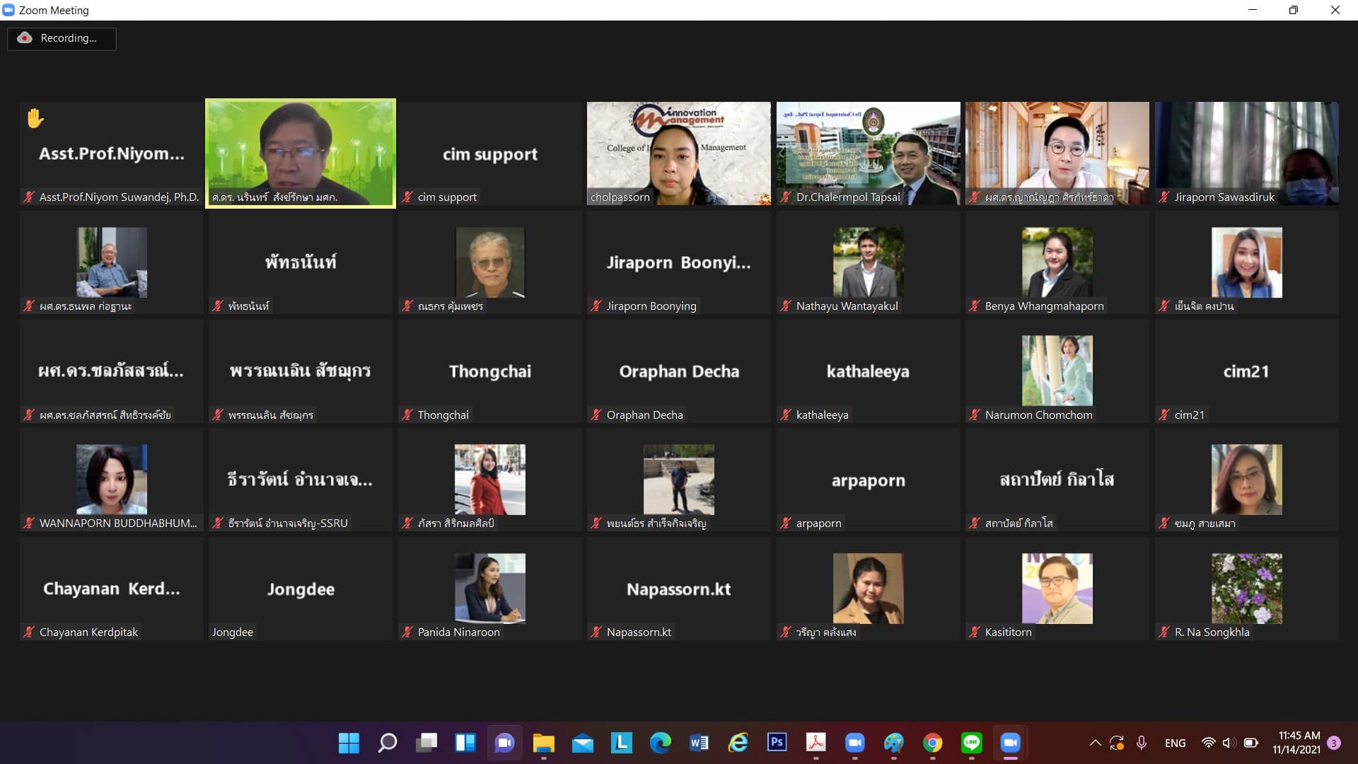 Sunday, November 14, 2021 Asst.Prof.Dr.Cholpassorn Sitthiwarongchai ,Associate Dean for Research and Academic Services College of Innovation and Management.Research-driven meeting, organized a workshop project “Writing a research project proposal for funding from external funding sources (Science, Research and Innovation Research Fellowships)” By Assoc.Prof.Dr.Bundit Pungnirund, Dean of the College of Innovation and Management presided over the opening speech of the project and was honored by Professor Dr. Narin Sangraksa as a speaker. The project is organized in the form of an online Zoom Meeting.