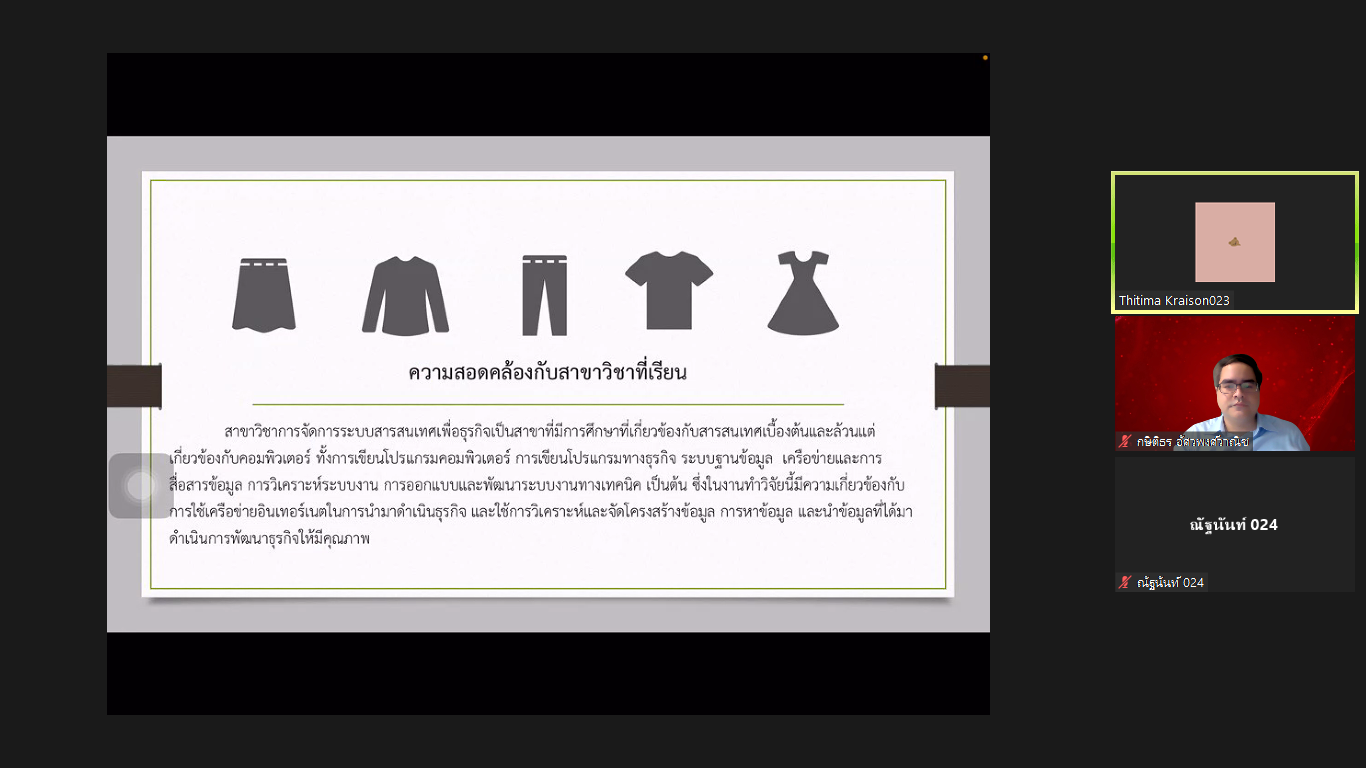 On February 8, 2022, Ajarn Kasititorn Asawapongwanich Organize a student meeting in the advisor To clarify the details, requirements for preparing a research project to support graduation requests.At the meeting, there was a selection of student representatives to receive the New Generation Businessmen Scholarship (Start-up) of the Ministry of NIDA and representatives to present research results at the national academic conference. "Technology and Innovation Management" and prepare activities in the next academic service project.