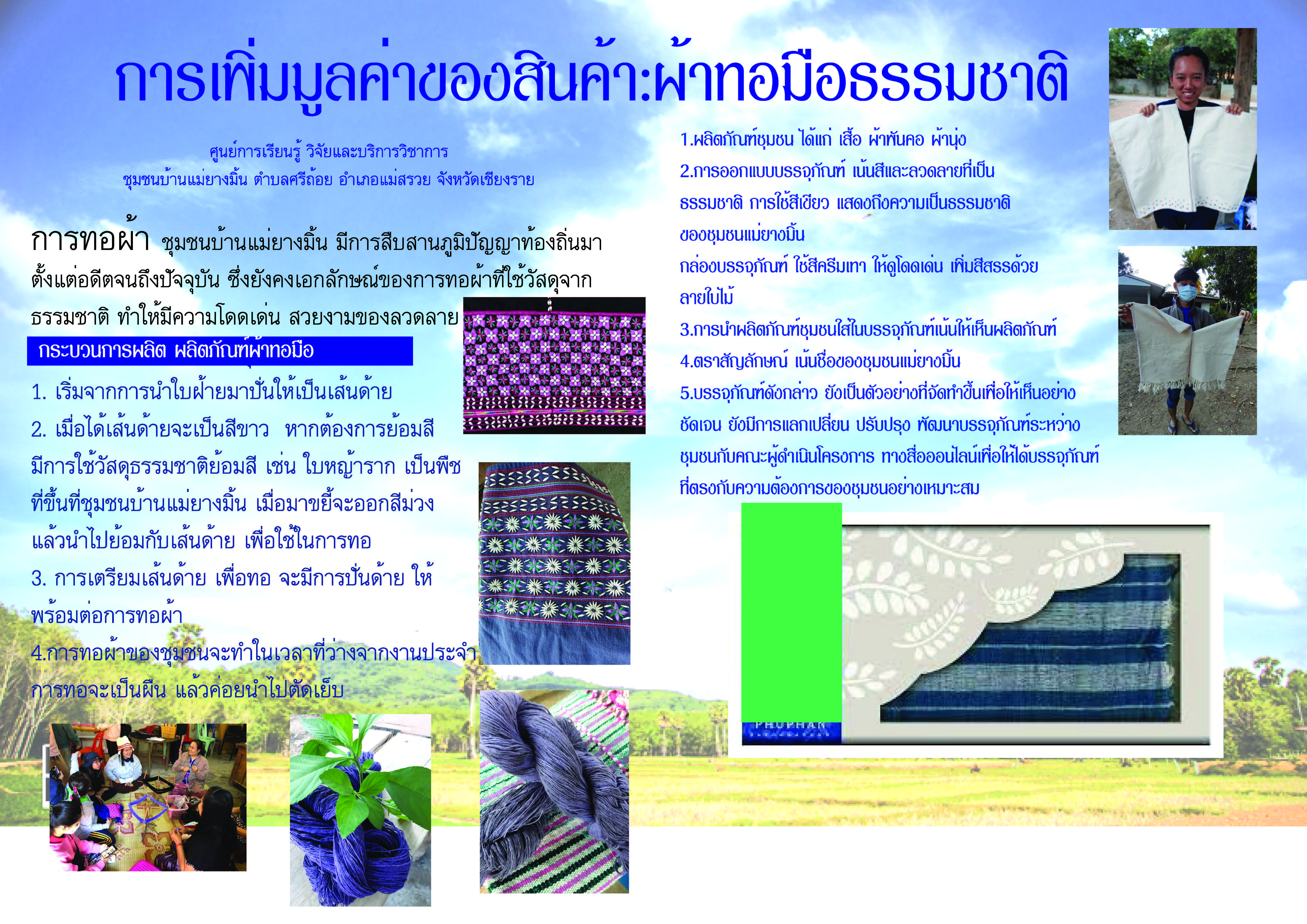 องค์ความรู้ การเพิ่มมูลค่าของสินค้า : ผ้าทอมือธรรมชาติเอกสารองค์ความรู้ คลิ๊กประเมินความพึ่งพอใจ คลิ๊ก
