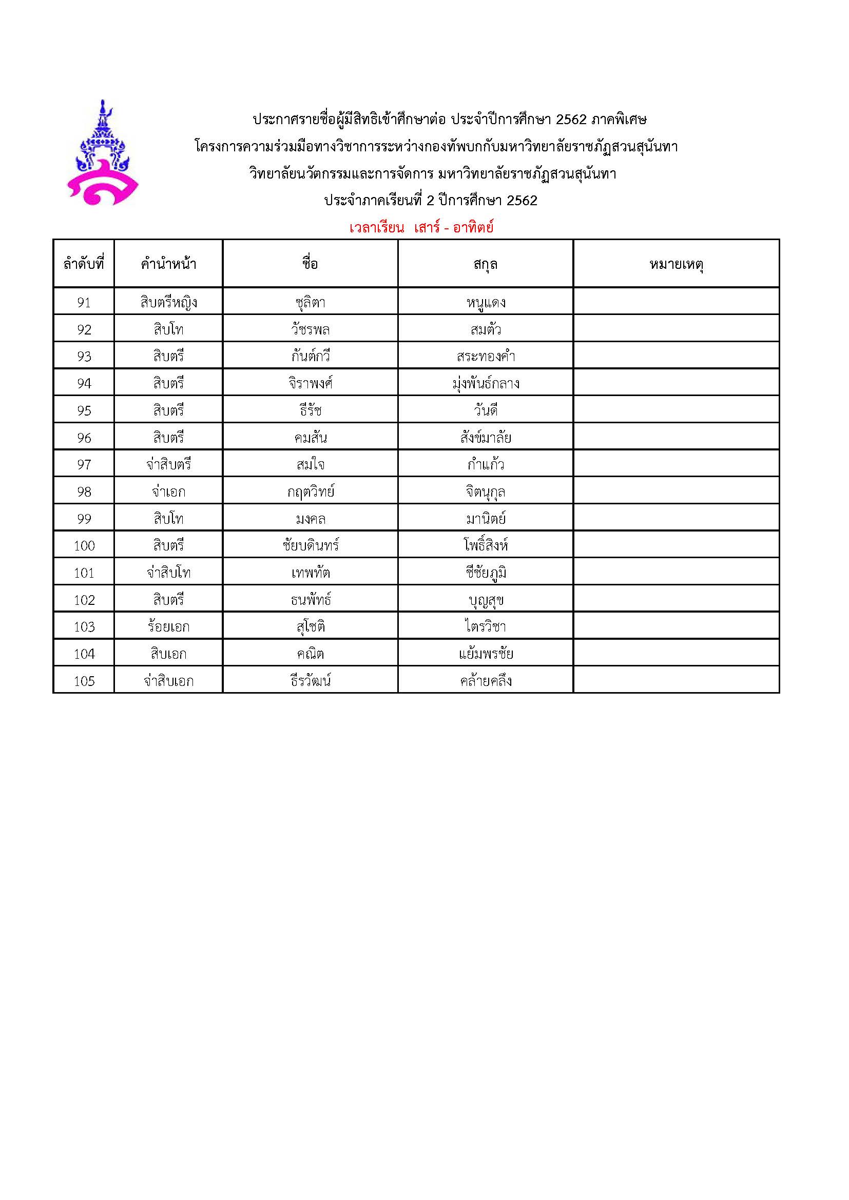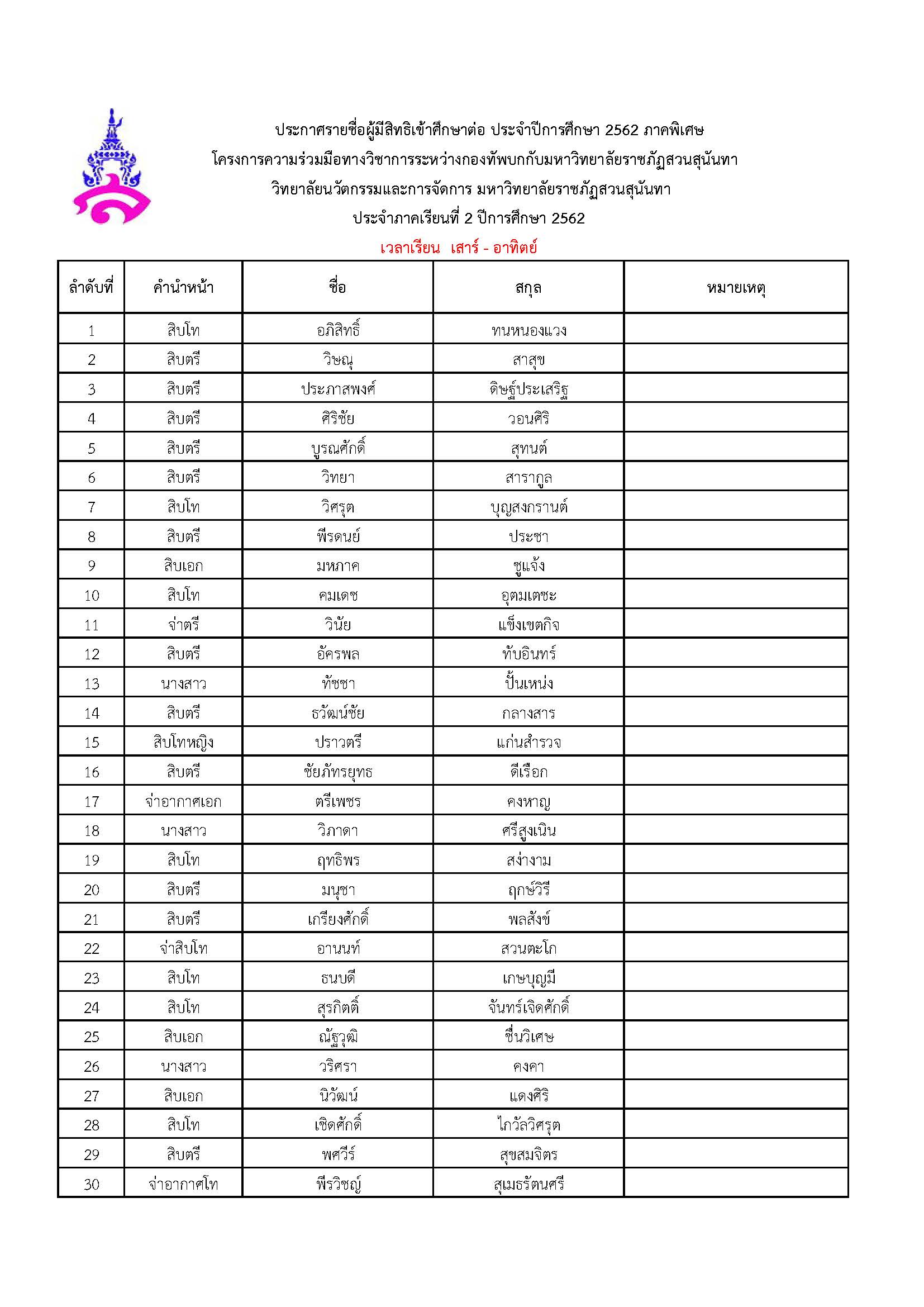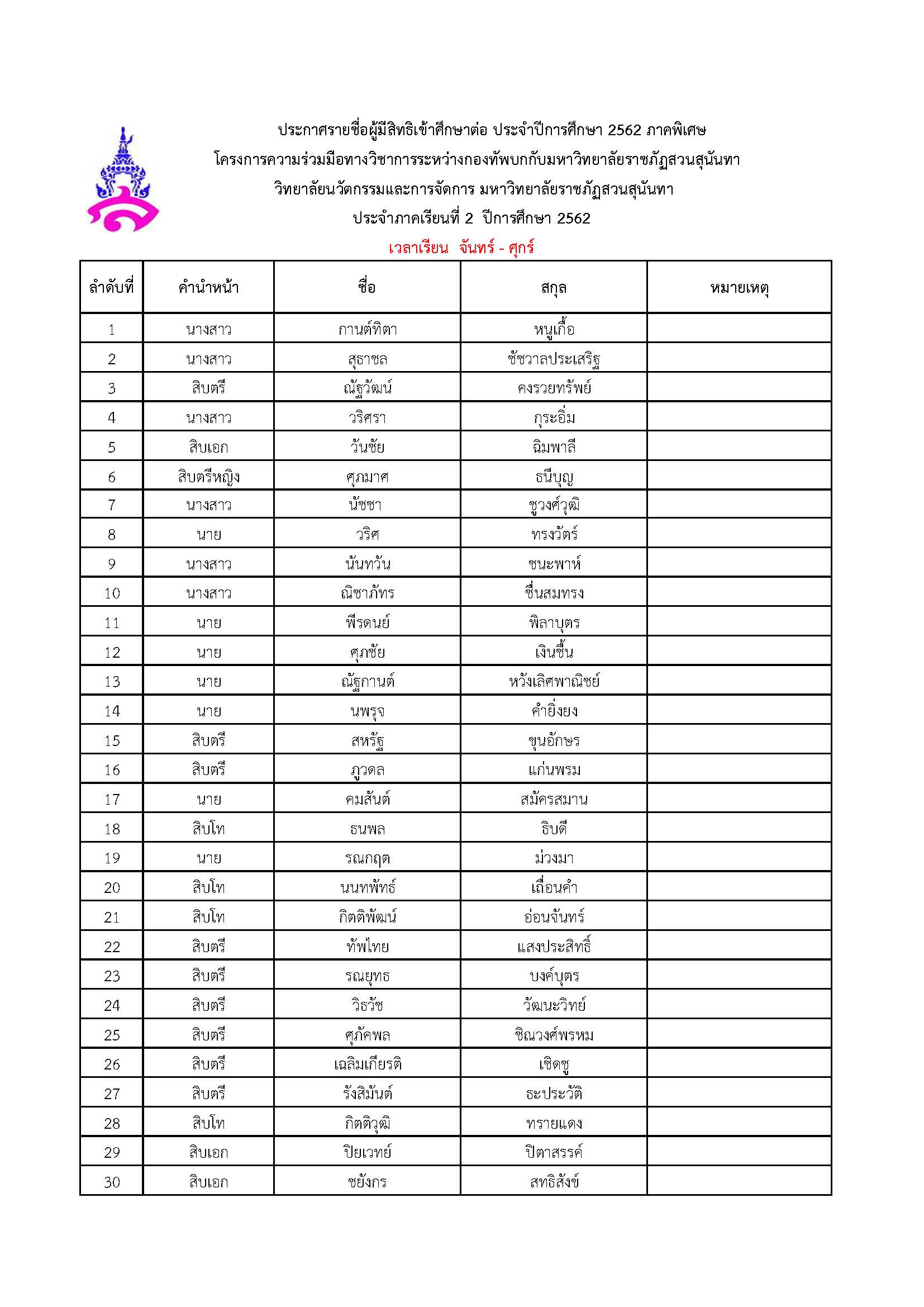 > ประกาศรายชื่อผู้มีสิทธิเข้าศึกษาต่อ ประจำปีการศึกษา 2562 ภาคพิเศษ โครงการความร่วมมือทางวิชาการระหว่างกองทัพบกกับ มหาวิทยาลัยราชภัฏสวนสุนันทา