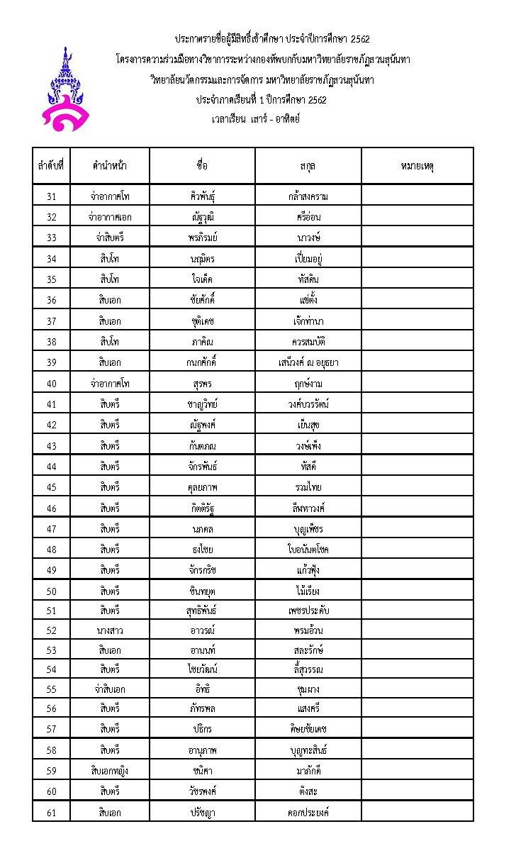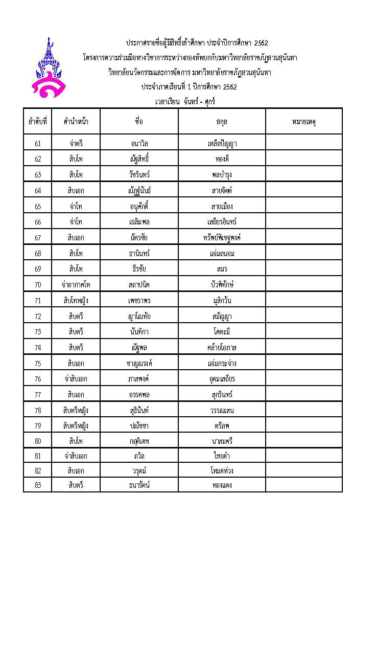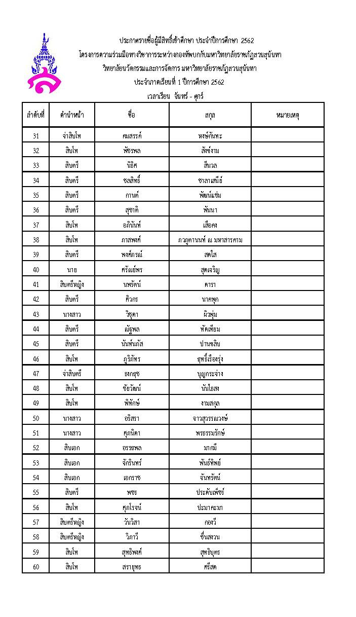 ประกาศรายชื่อผู้มีสิทธิ์เข้าศึกษา ประจำปีการศึกษา 2562 โครงการความร่วมมือทางวิชาการระหว่างกองทัพบกกับมหาวิทยาลัยราชภัฏสวนสุนันทา ประจำภาคเรียนที่ 1 ปีการศึกษา 2562 เวลาเรียน จันทร์ - ศุกร์ , เสาร์ - อาทิตย์