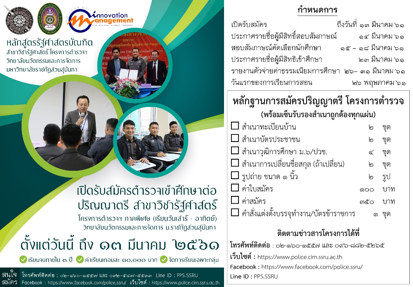 เปิดรับ ป.ตรี โครงการตำรวจฯ หลักสูตรรัฐศาสตรบัณฑิต สาขาวิชารัฐศาสตร์ (ภาคพิเศษ) โครงการความร่วมมือตำรวจฯ เปิดรับสมัคร กับมหาวิทยาลัยราชภัฏสวนสุนันทา เปิดรับสมัครข้าราชการตำรวจเพื่อเข้าศึกษาต่อในระดับปริญญาตรี (รัฐศาสตร์) ตั้งแต่วันนี้ – 13 มีนาคม 2561 สมัครออนไลน์โดยดาวน์โหลดใบสมัครได้ดังนี้ : ใบสมัครโครงการตำรวจ.pdf สอบถามรายละเอียดเพิ่มเติม