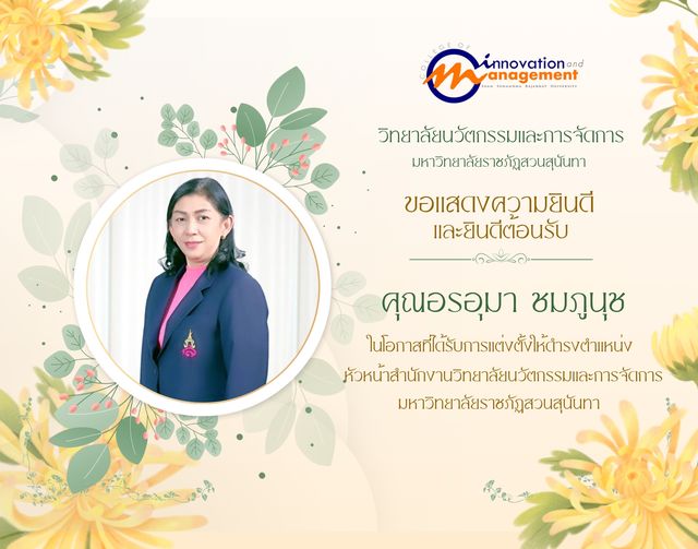 วิทยาลัยนวัตกรรมและการจัดการ มหาวิทยาลัยราชภัฏสวนสุนันทา ขอแสดงความยินดี และยินดีต้อนรับ คุณอรอุมา ชมภูนุช ในโอกาสที่ได้รับการแต่งตั้งให้ดำรงตำแหน่ง หัวหน้าสำนักงาน วิทยาลัยนวัตกรรมและการจัดการ มหาวิทยาลัยราชภัฏสวนสุนันทา