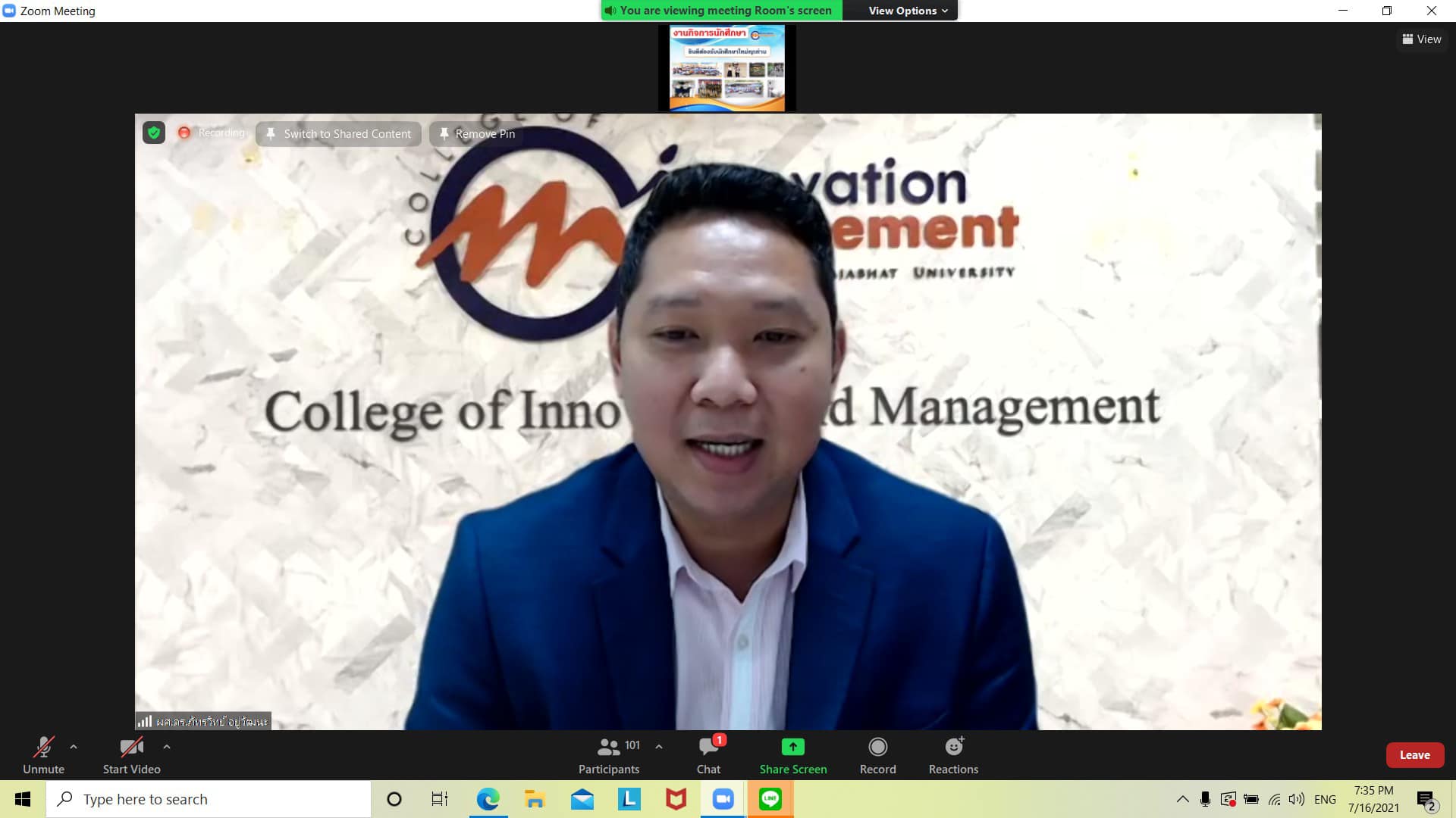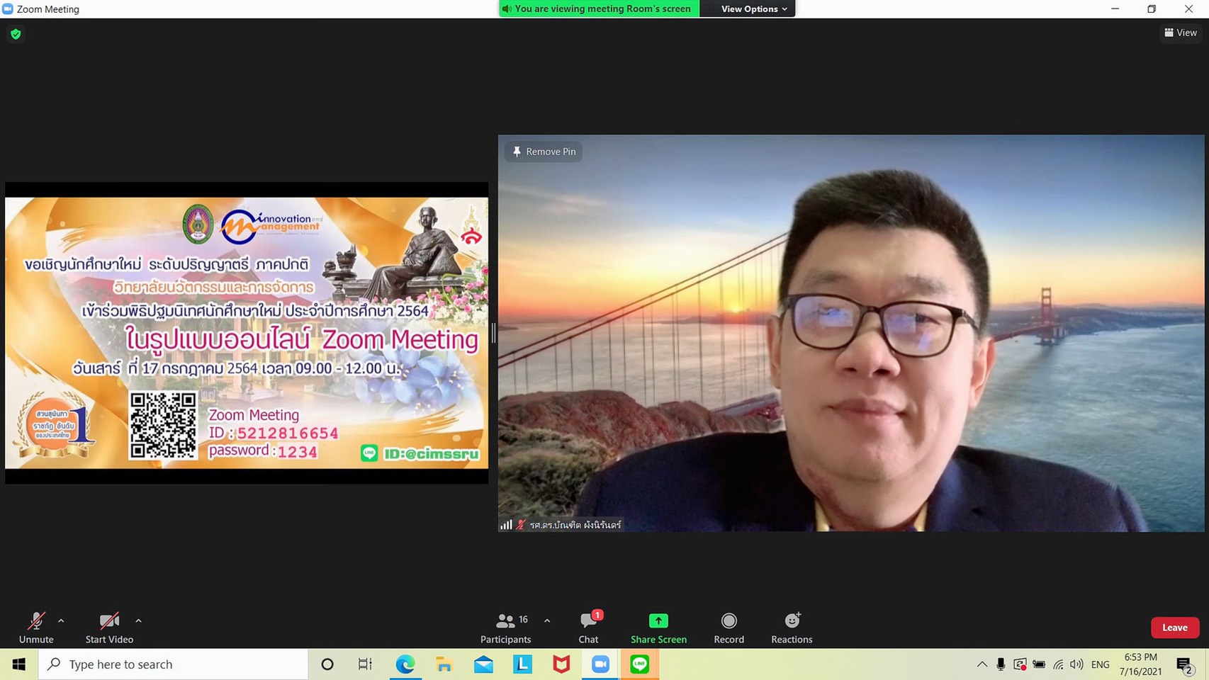 วิทยาลัยนวัตกรรมและการจัดการ มหาวิทยาลัยราชภัฏสวนสุนันทา จัดโครงการปฐมนิเทศนักศึกษาใหม่ ระดับปริญญาตรี ภาคปกติ ประจำปีการศึกษา 2564 โดย รศ.ดร.บัณฑิต ผังนิรันดร์ คณบดีวิทยาลัยนวัตกรรมและการจัดการ เป็นประธานกล่าวต้อนรับนักศึกษาใหม่ พร้อมด้วย ผศ.ดร.ปรเมษฐ์ แสงอ่อน รองคณบดีฝ่ายบริหาร โดย ผศ.ดร.ชลภัสสรณ์ สิทธิวรงค์ชัย รองคณบดีฝ่ายวิจัยและบริการวิชาการ ผศ.หทัยพันธน์ สุนทรพิพิธ รองคณบดีฝ่ายกิจการต่างประเทศ ผศ.ดร.ภัทรวิทย์ อยู่วัฒนะ รองคณบดีฝ่ายกิจการนักศึกษา และ ผศ.ดร.สุพัตรา ปราณี รองคณบดีฝ่ายวิชาการ กล่าวต้อนรับนักศึกษา โดยโครงการดังกล่าว จัดด้วยระบบออนไลน์ Zoom Cloud Meeting