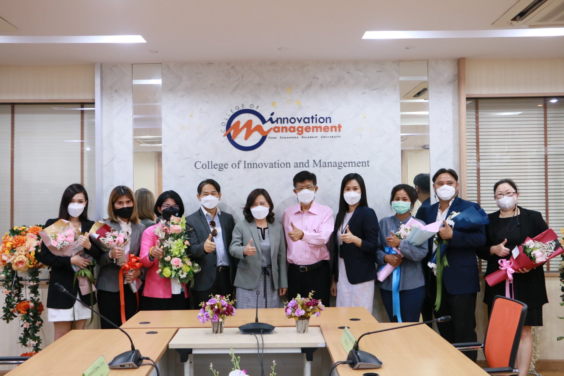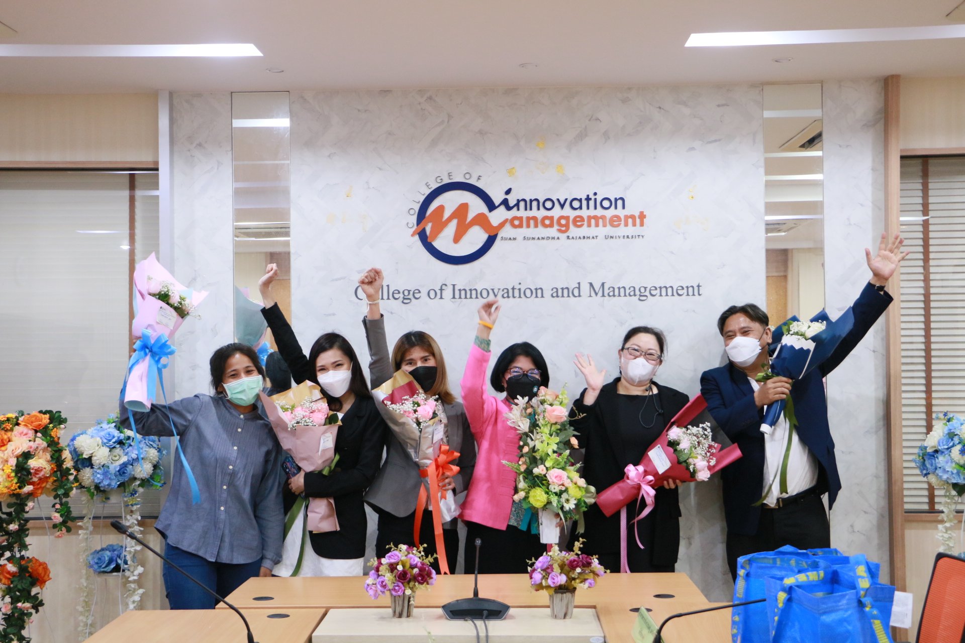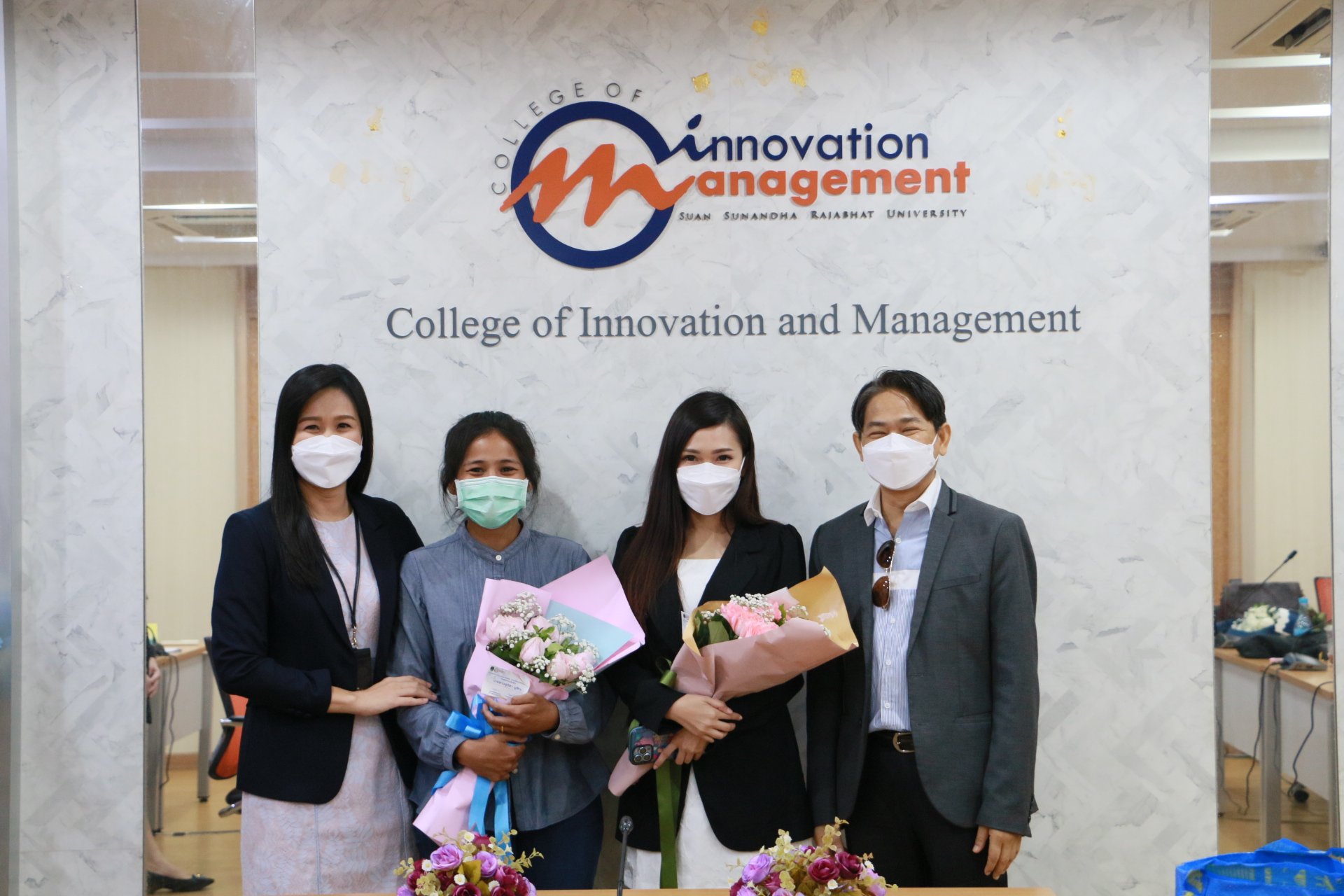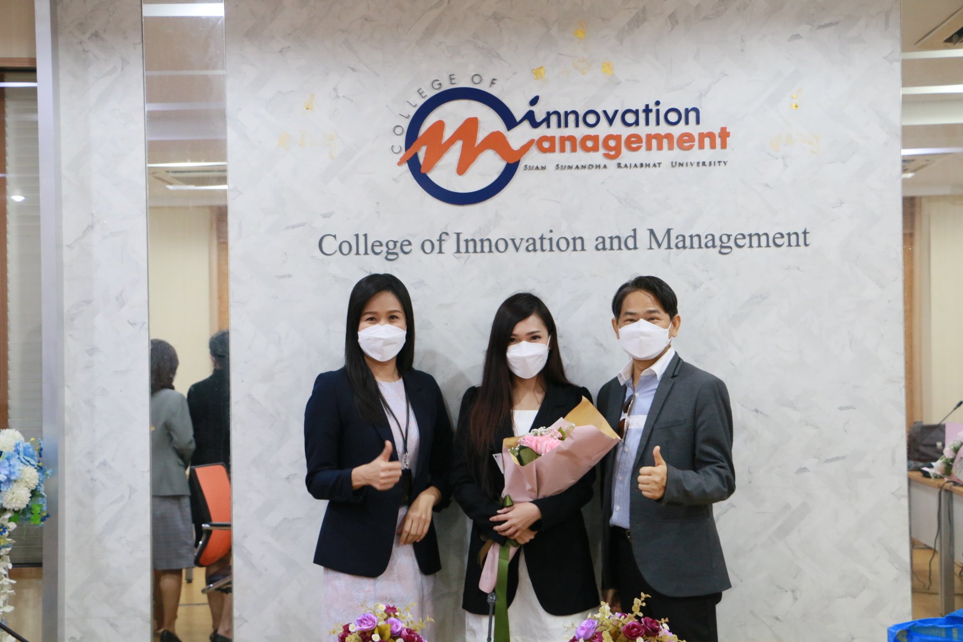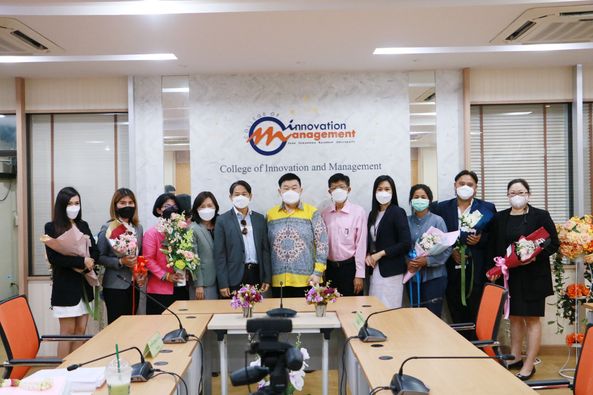 รองศาสตราจารย์ ดร.บัณฑิต ผังนิรันดร์ คณบดีวิทยาลัยนวัตกรรมและการจัดการ และผศ.ดร.ปรเมษฐ์ แสงอ่อน รองคณบดีฝ่ายบริหาร พร้อมด้วยคณาจารย์ ร่วมแสดงความยินดีกับนักศึกษาหลักสูตรการจัดการมหาบัณฑิต สาขาวิชานวัตกรรมการจัดการ วิทยาลัยนวัตกรรมและการจัดการ มหาวิทยาลัยราชภัฏสวนสุนันทา ในโอกาสสอบป้องกันวิทยานิพนธ์และการค้นคว้าอิสระผ่านในระดับดีเยี่ยม และสามารถต่อยอดงานวิจัยสู่เชิงพาณิชย์