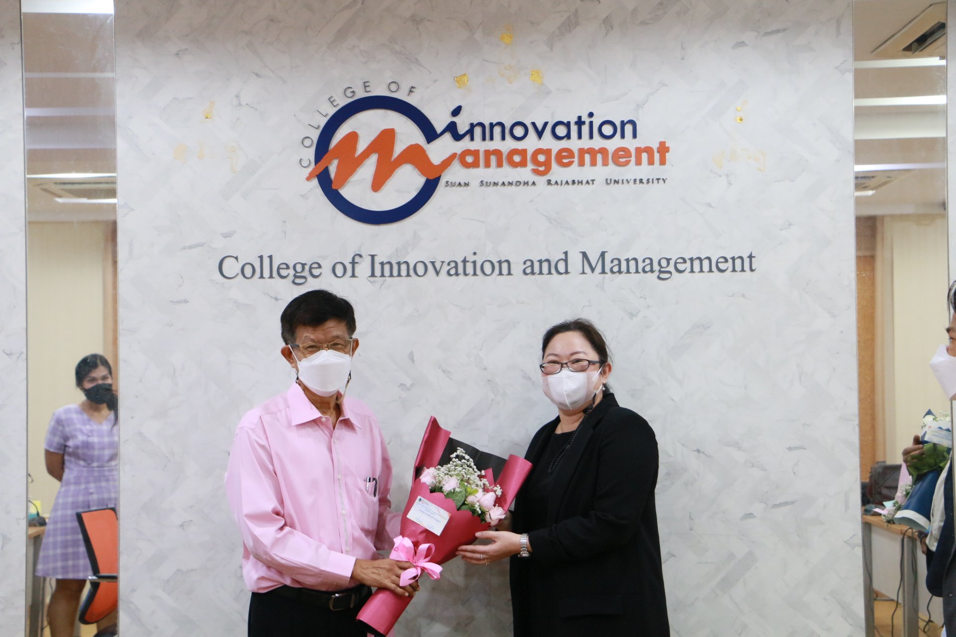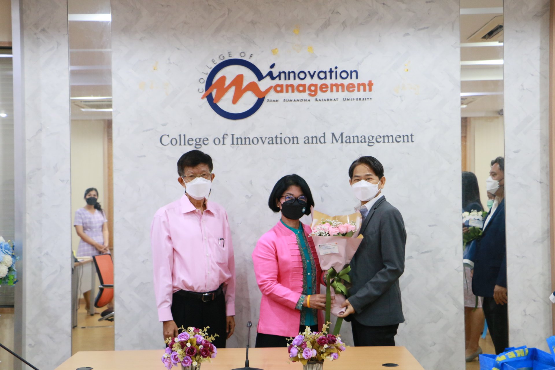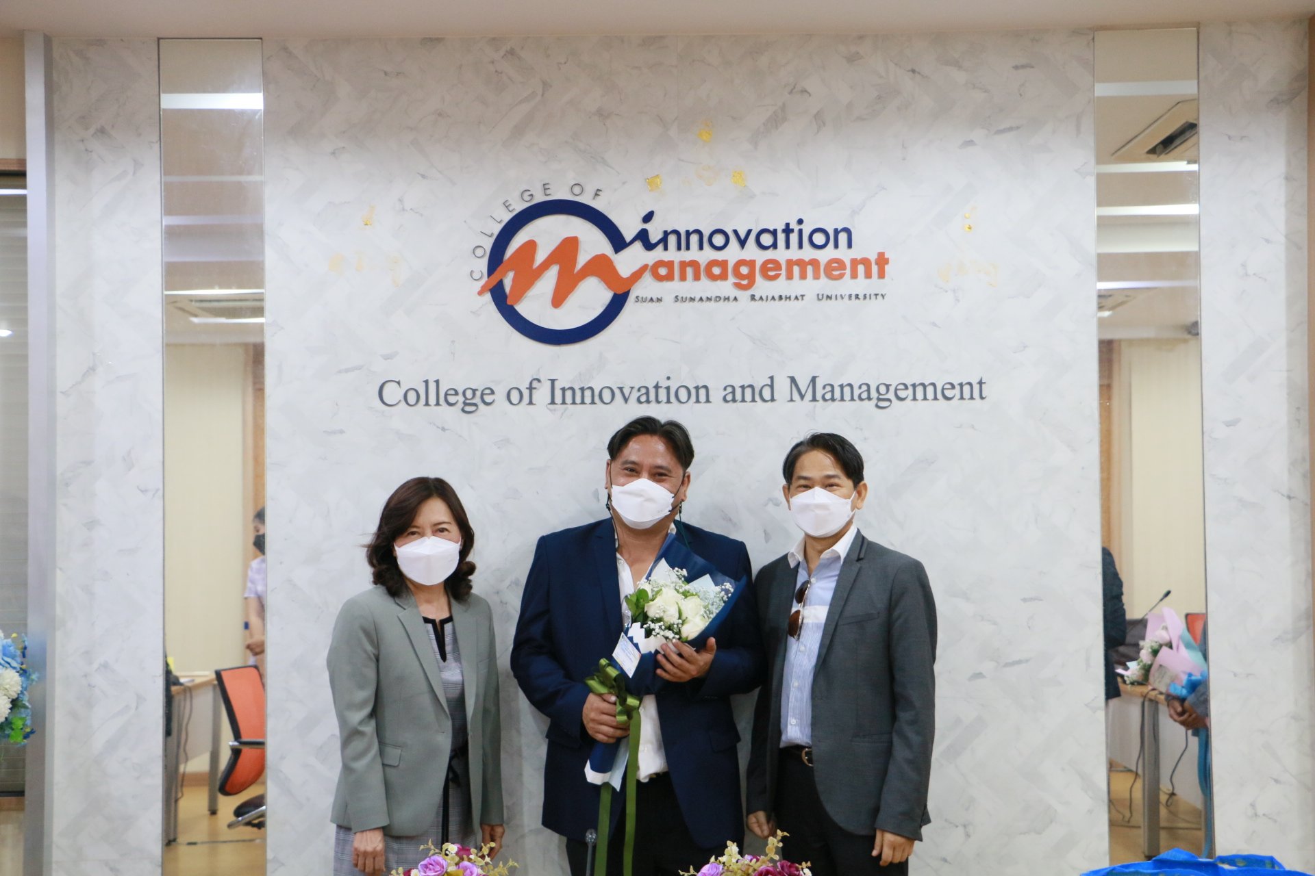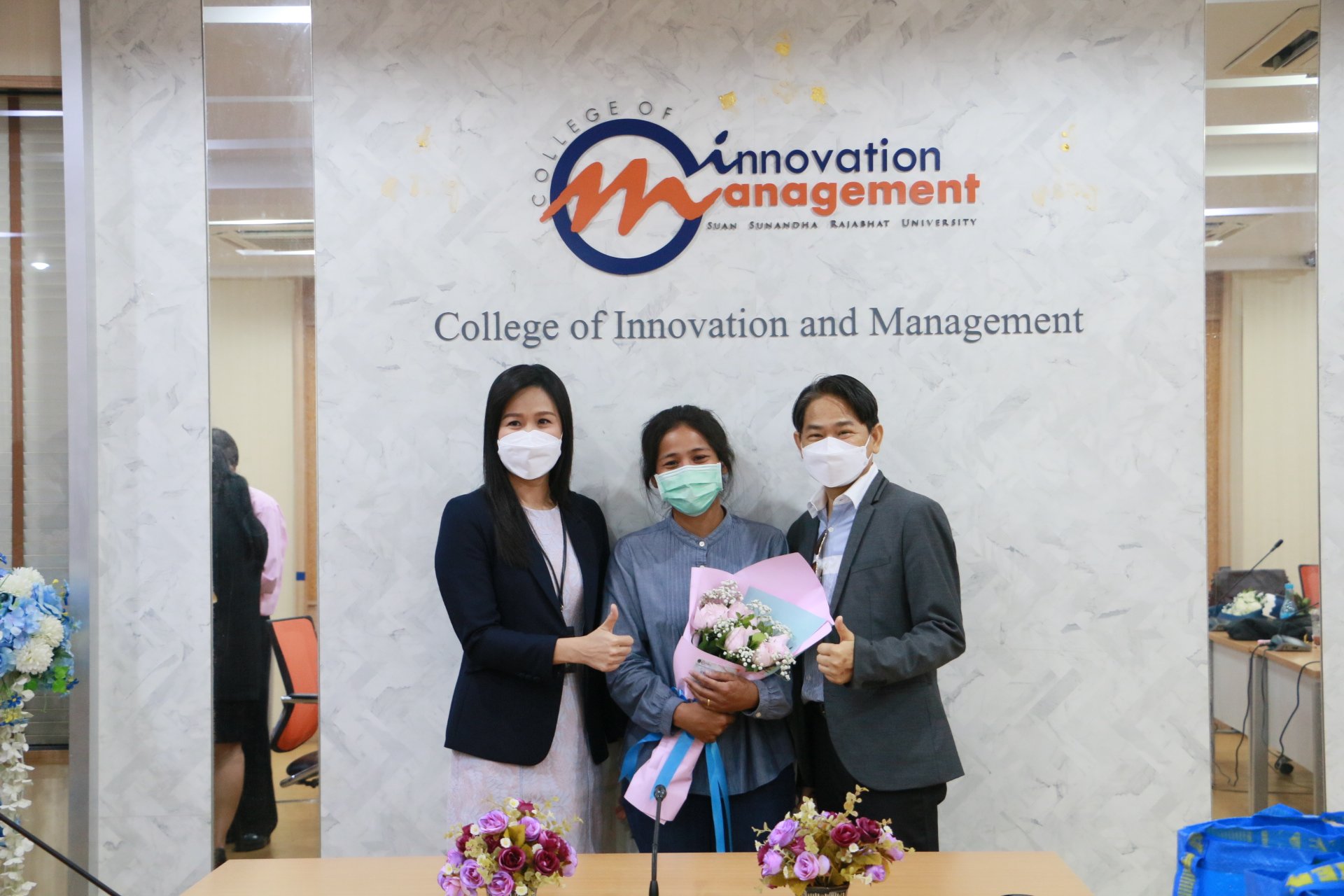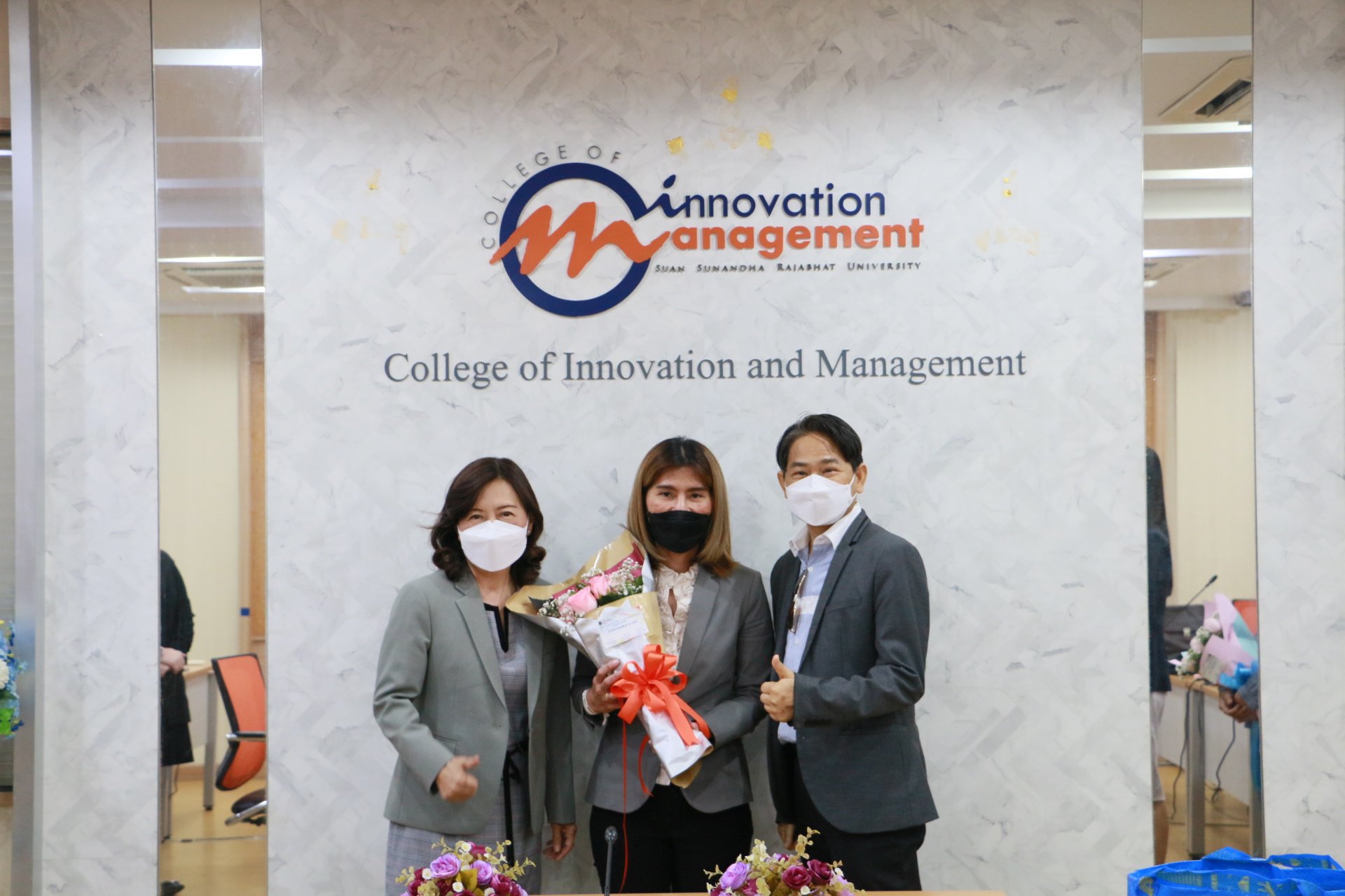 รองศาสตราจารย์ ดร.บัณฑิต ผังนิรันดร์ คณบดีวิทยาลัยนวัตกรรมและการจัดการ และผศ.ดร.ปรเมษฐ์ แสงอ่อน รองคณบดีฝ่ายบริหาร พร้อมด้วยคณาจารย์ ร่วมแสดงความยินดีกับนักศึกษาหลักสูตรการจัดการมหาบัณฑิต สาขาวิชานวัตกรรมการจัดการ วิทยาลัยนวัตกรรมและการจัดการ มหาวิทยาลัยราชภัฏสวนสุนันทา ในโอกาสสอบป้องกันวิทยานิพนธ์และการค้นคว้าอิสระผ่านในระดับดีเยี่ยม และสามารถต่อยอดงานวิจัยสู่เชิงพาณิชย์