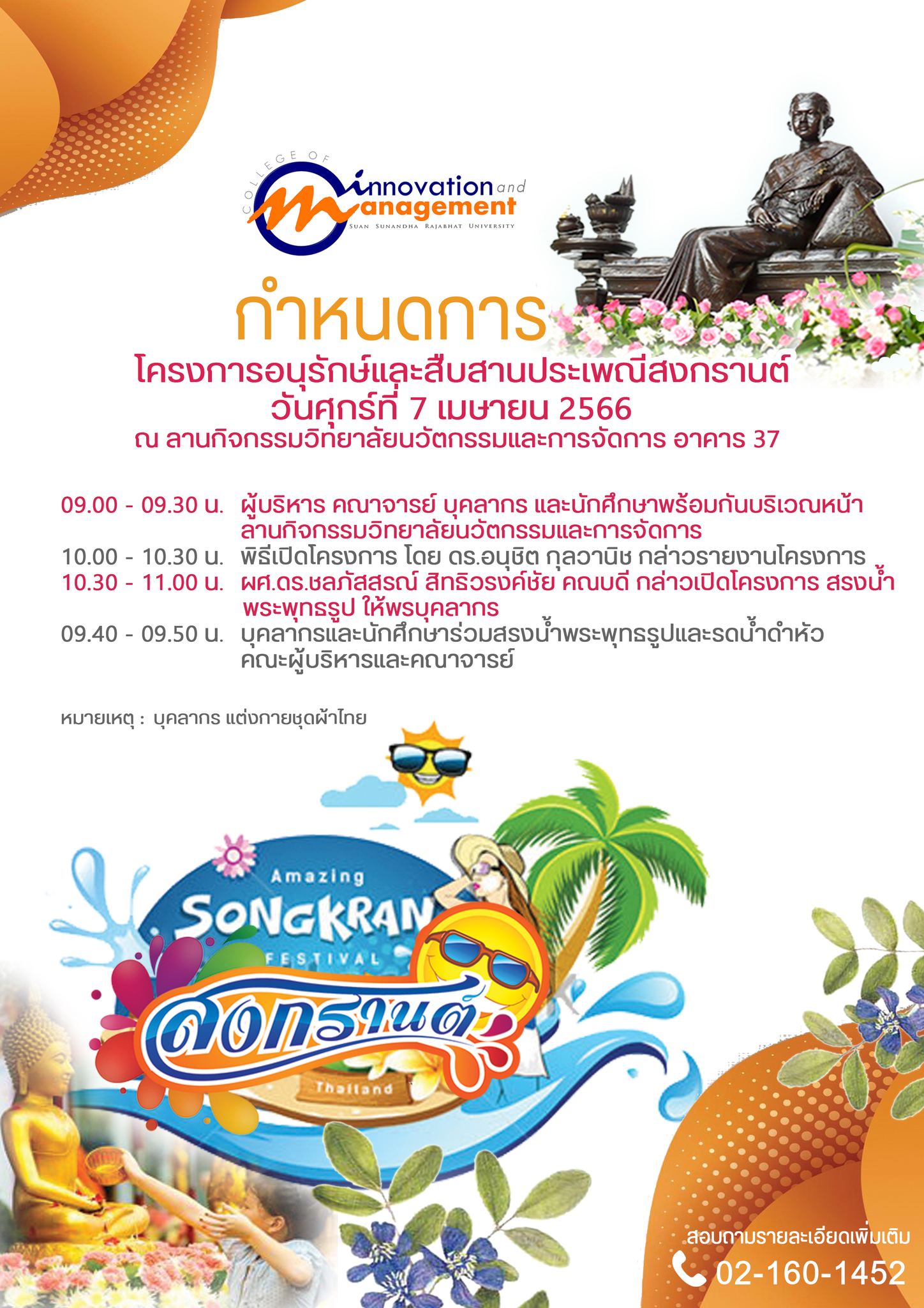 ขอเรียนเชิญ คณะผู้บริหาร คณาจารย์ เจ้าหน้าที่ และนักศึกษา เข้าร่วมโครงการอนุรักษ์สืบสานประเพณีสงกรานต์ วิทยาลัยนวัตกรรมและการจัดการ ในวันศุกร์ที่ 7 เมษายน 2565 เวลา 09.00 เป็นต้นไป ณ ลานกิจกรรม ชั้น1 วิทยาลัยนวัตกรรมและการจัดการ อาคารเหมวดีพิทักษ์ (อาคาร37)
