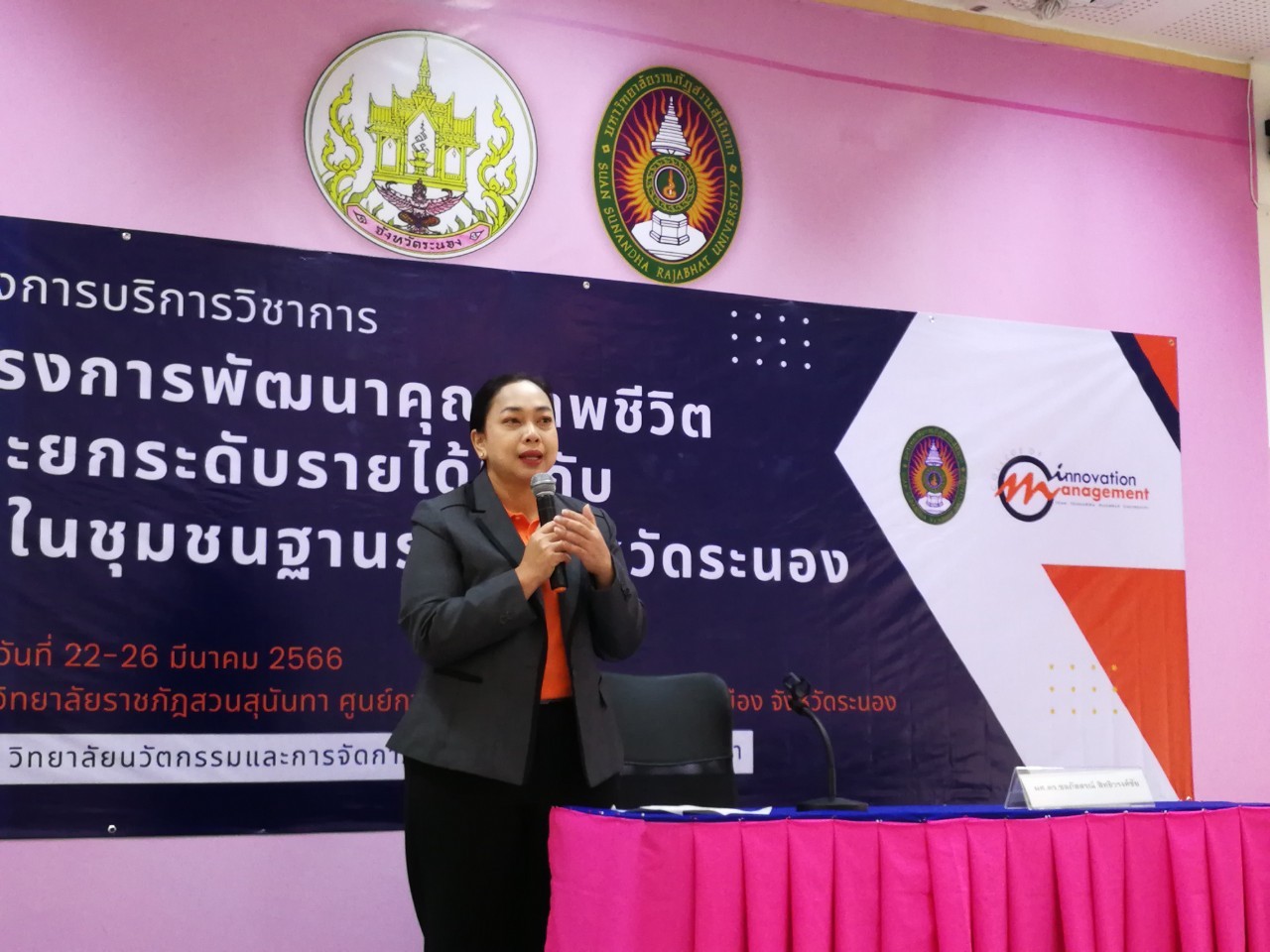 22-27 มีนาคม 2566 ที่ผ่านมา ฝ่ายวิจัยและบริการวิชาการ วิทยาลัยนวัตกรรมและการจัดการ มหาวิทยาลัยราชภัฏสวนสุนันทา ลงพื้นที่บริการวิชาการ โครงการบริการวิชาการ พัฒนาคุณภาพชีวิตและยกระดับรายได้ให้กับคนในชุมชนฐานราก จังหวัดระนอง "การพัฒนาผลิตภัณฑ์ ผลผลิตชุมชน เพื่อการจัดจำหน่ายและสร้างรายได้อย่างยั่งยืน" นำทีมโดย ผศ.ดร.ชลภัสสรณ์ สิทธิวรงค์ชัย คณบดีวิทยาลัยนวัตกรรมและการจัดการ พร้อมด้วย ผศ.ดร.สุพัตรา ปราณี รองคณบดีฝ่ายวิจัยและบริการวิชาการ ผู้ร่วมโครงการ อาจารย์ ดร.วิชา ขันคำ อาจารย์ ดร.มุกด์ตรา ทองเวส พร้อมบุคลากรที่เกี่ยวข้อง