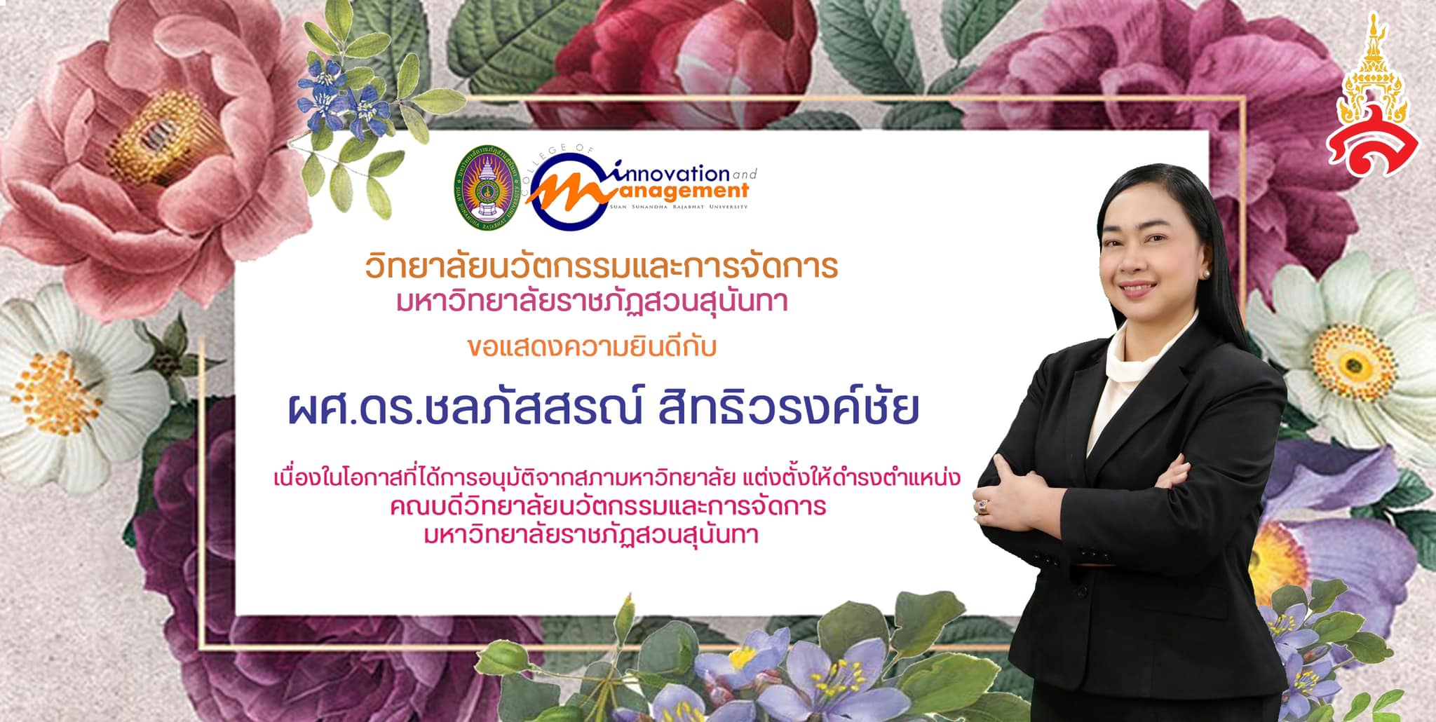College of Innovation and Management Congratulations to Asst. prof. Dr. Cholpassorn Sitthiwarongchai on being appointed Dean of the College of Innovation and Management at Suan Sunandha Rajabhat University by the University Council in meeting No. 11/2022 on Wednesday, November 30, 2022.
