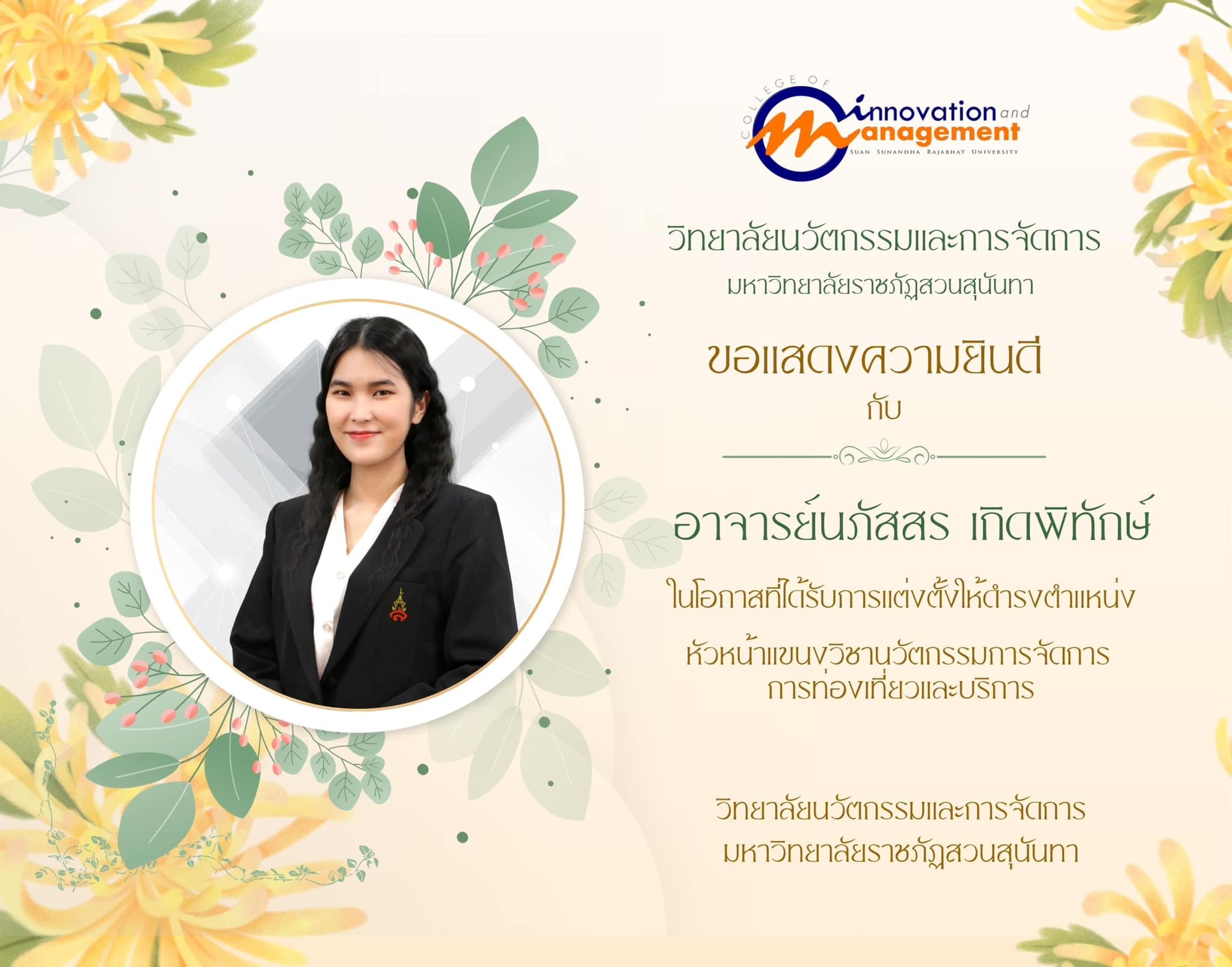 อาจารย์นภัสสร เกิดพิทักษ์ ในโอกาสที่ได้รับการแต่งตั้งให้ดำรงตำแหน่ง หัวหน้าแขนงวิชานวัตกรรมการจัดการการท่องเที่ยวและบริการ