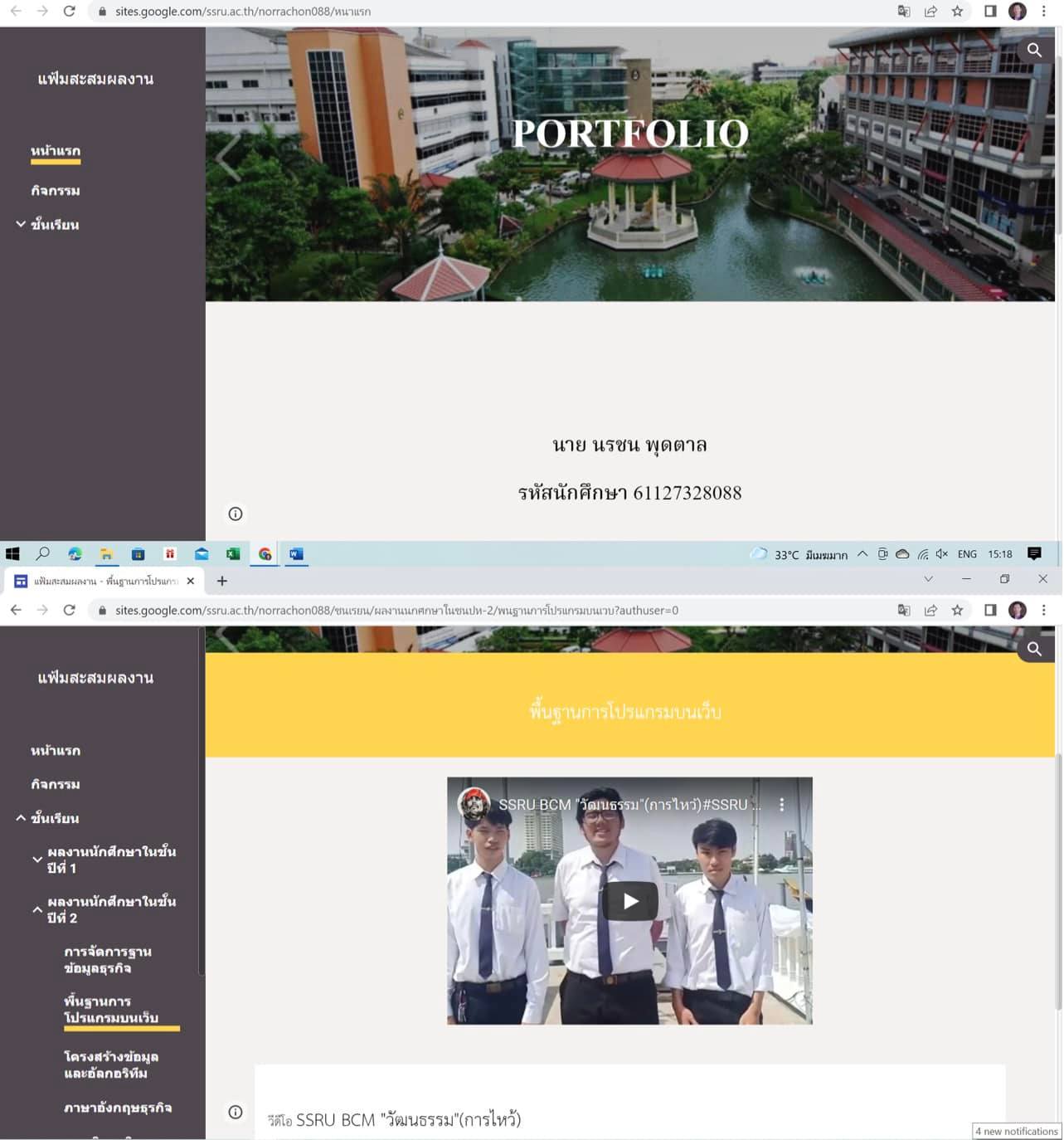 นักศึกษาชั้นปีที่ 4 สาขาวิชาคอมพิวเตอร์ธุรกิจ นำเสนอแฟ้มสะสมผลงาน (Portfolio) ด้วย Google Sites ซึ่งเป็นส่วนหนึ่งของรายวิชาการฝึกประสบการณ์วิชาชีพ ในภาคเรียนที่ 2/2564 โดยมีข้อมูลประวัติของนักศึกษาและสรุปผลงาน/ชิ้นงาน/เว็บไซต์/ระบบสารสนเทศ ที่นักศึกษาได้พัฒนาจากการเรียนในรายวิชาต่างๆ ตั้งแต่ชั้นปีที่ 1-4