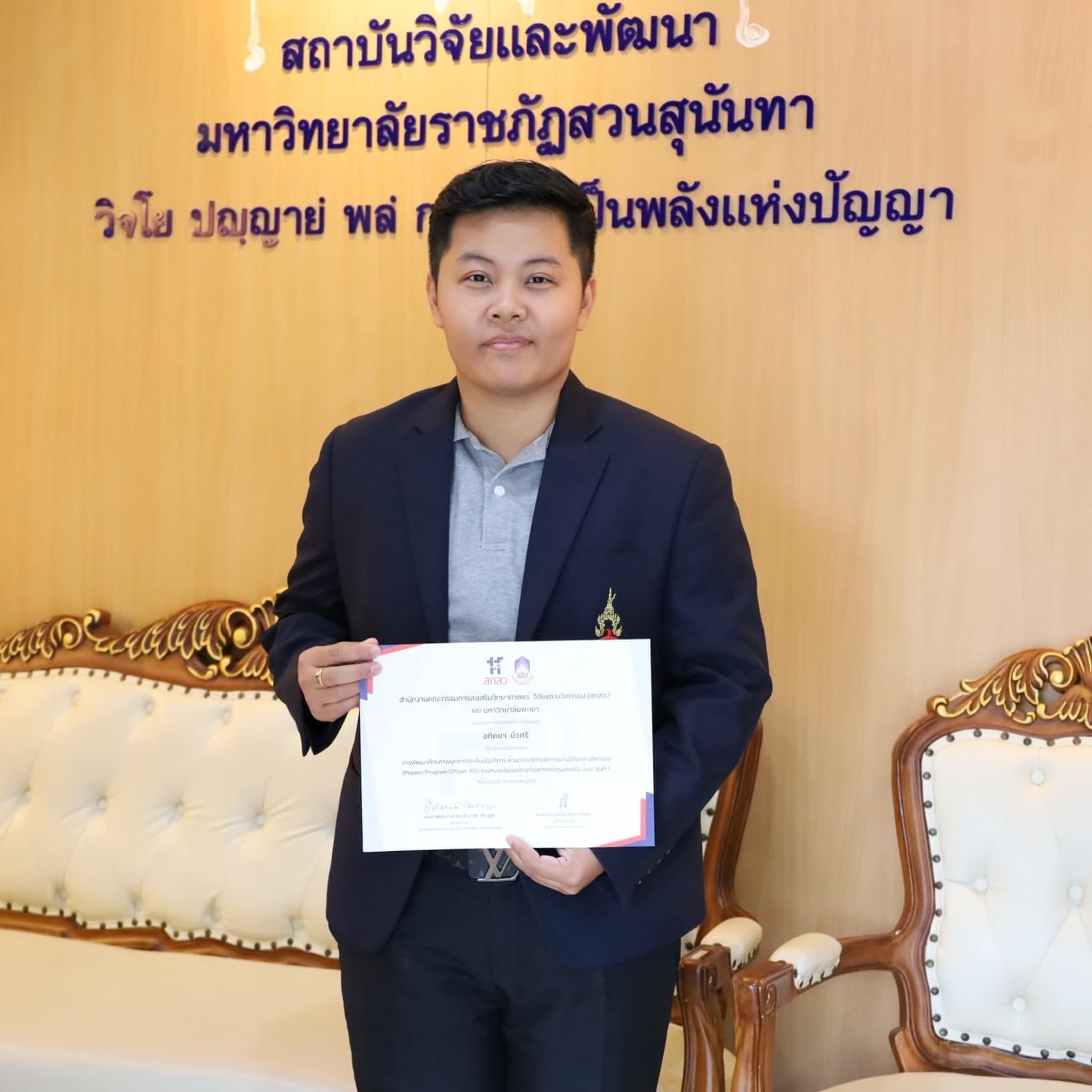 วันอังคารที่ 10 มกราคม 2566 อาจารย์อทิตยา บัวศรี ผู้จัดการหน่วยบ่มเพาะวิสาหกิจ สถาบันวิจัยและพัฒนา มหาวิทยาลัยราชภัฏสวนสุนันทา เข้ารับประกาศนียบัตรโครงการ “การพัฒนาศักยภาพบุคลากรระดับปฏิบัติการด้านการบริหารจัดการงานวิจัยและนวัตกรรม (Project/Program Officer: PO) ของหน่วยรับงบประมาณจากกองทุนส่งเสริม ววน.” รุ่นที่ 1 โดยมี รศ.ดร.ปัทมาวดี โพชนุกูล ผู้อำนวยการสำนักงานคณะกรรมการส่งเสริมวิทยาศาสตร์ วิจัยและนวัตกรรม (สกสว.) เป็นประธานในพิธีมอบประกาศนียบัตร ณ โรงแรมเซ็นจูรี่ ปาร์ค กรุงเทพมหานคร
