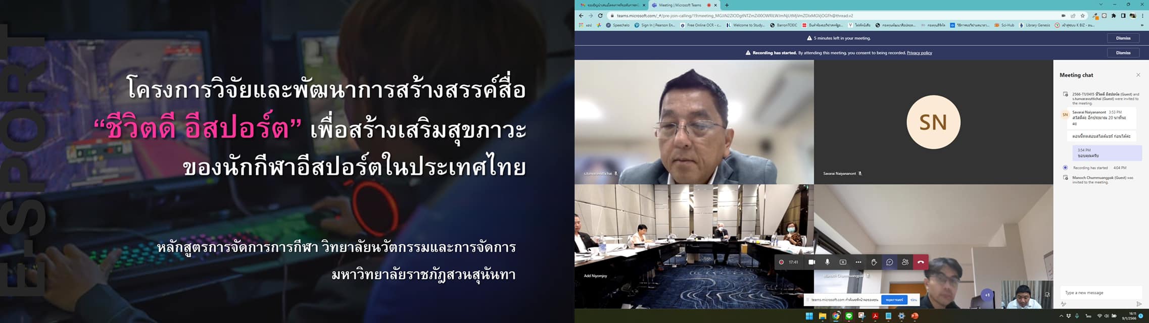 เมื่อวันที่ 9 มกราคม 2566 อ.ดร.พิเชษฐ์ เกิดวิชัย และ อ.ธนพล จึงศิรกุลวิทย์ เข้าร่วมนำเสนอ "โครงการวิจัยและพัฒนาการสร้างสรรค์สื่อ “ชีวิตดี อีสปอร์ต” เพื่อสร้างเสริมสุขภาวะของนักกีฬาอีสปอร์ตในประเทศไทย" ต่อคณะทำงานพิจารณาและพัฒนาข้อเสนอโครงการหรือกิจกรรม ประเภทเปิดรับทั่วไป ชุดที่ 1 ประเภทโครงการที่มีงบประมาณที่ขอรับการสนับสนุนตั้งแต่ 5,000,001 บาท ขึ้นไป กลุ่มเด็กและเยาวชน เพื่อขอรับการสนับสนุนโครงการจากกองทุนพัฒนาสื่อปลอดภัยและสร้างสรรค์ ประจำปี 2566 ผ่านโปรแกรม ZOOM