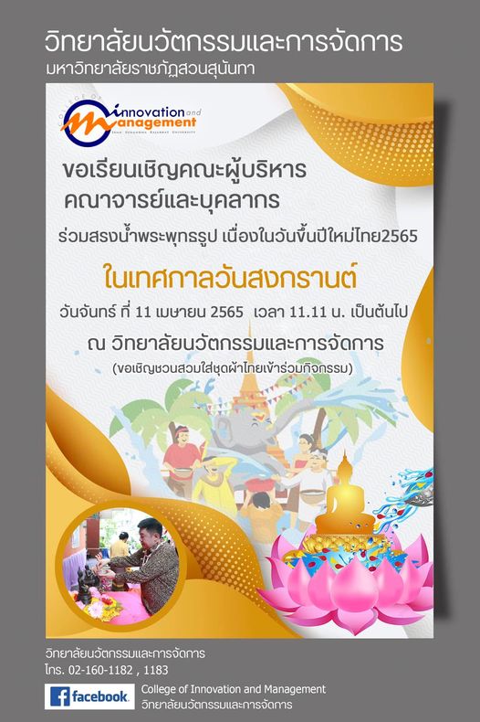 ขอเรียนเชิญคณะผู้บริหาร คณาจารย์และบุคลากร ร่วมสรงน้ำพระพุทธรูป เนื่องในวันขึ้นปีใหม่ไทย2565 ในเทศกาลวันสงกรานต์ วันจันทร์ ที่ 11 เมษายน 2565 11.11 น. เป็นต้นไป ณ วิทยาลัยนวัตกรรมและการจัดการ อาคาร 3
