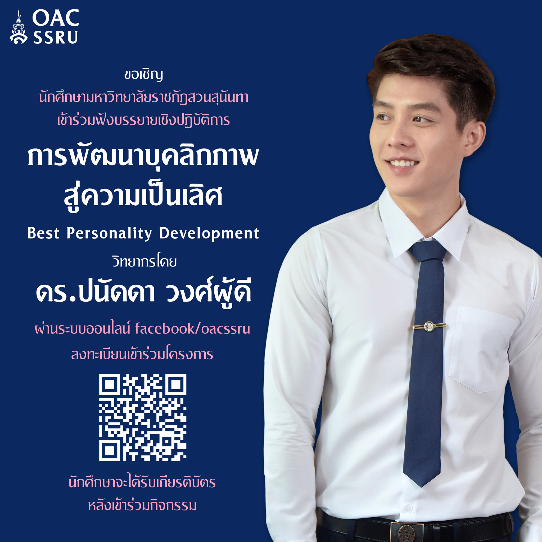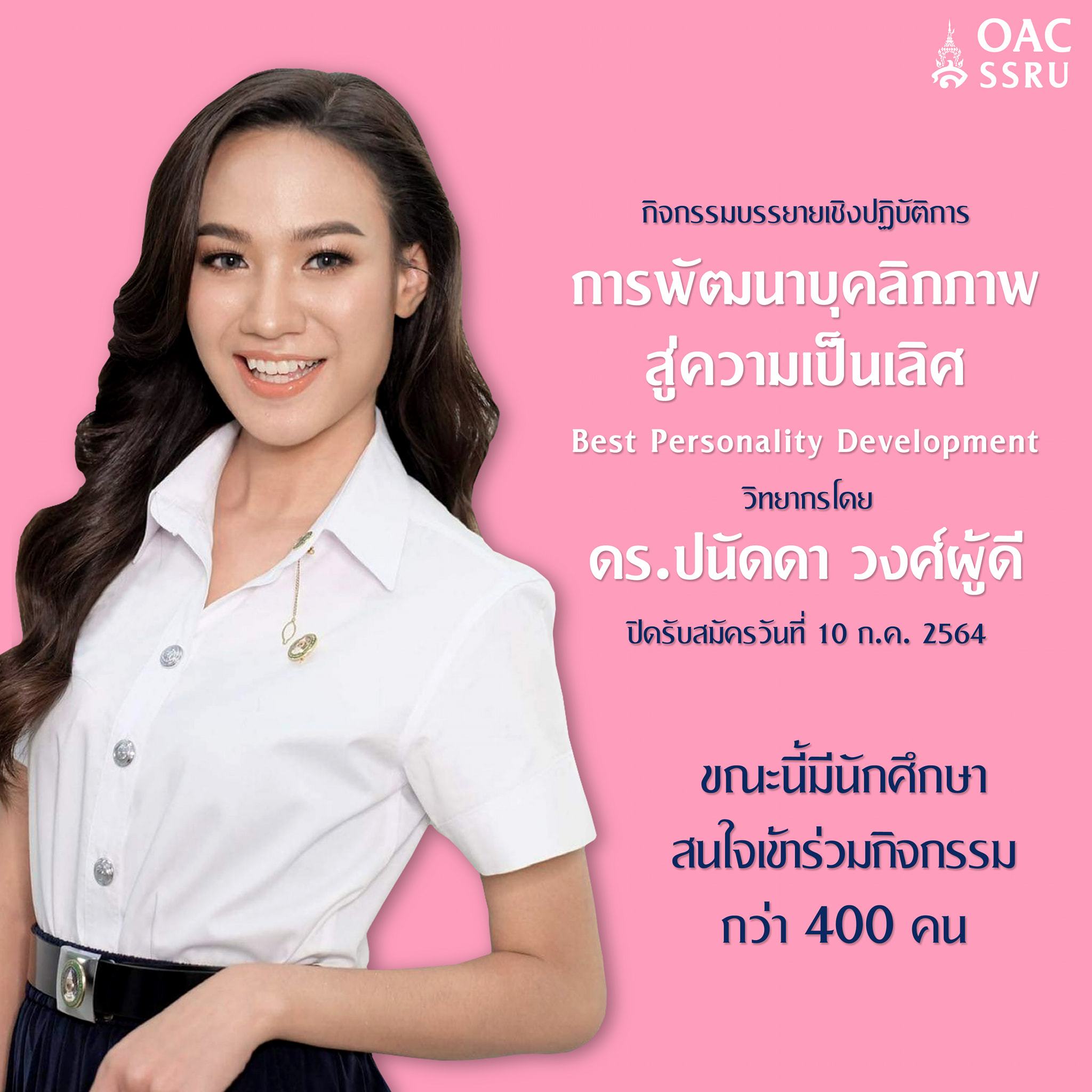 สำนักศิลปะและวัฒนธรรม มหาวิทยาลัยราชภัฏสวนสุนันทา ขอเชิญนักศึกษาเข้าร่วมกิจกรรมโครงการสืบทอดมรดกและสืบสานวัฒนธรรมสวนสุนันทา ในรูปแบบการจัดกิจกรรมอบรมบรรยายเชิงปฏิบัติการในหัวข้อ "Best Personality Development" "การพัฒนาบุคลิกภาพสู่ความเป็นเลิศ" วิทยากรโดย ดร.ปนัดดา วงศ์ผู้ดี ในวันจันทร์ที่ 19 กรกฎาคม พ.ศ.2564 เวลา 09.30 - 12.00 น. ผ่านระบบออนไลน์ (นักศึกษาที่เข้าร่วมกิจกรรมจะได้รับ 3 หน่วยกิจกรรม)