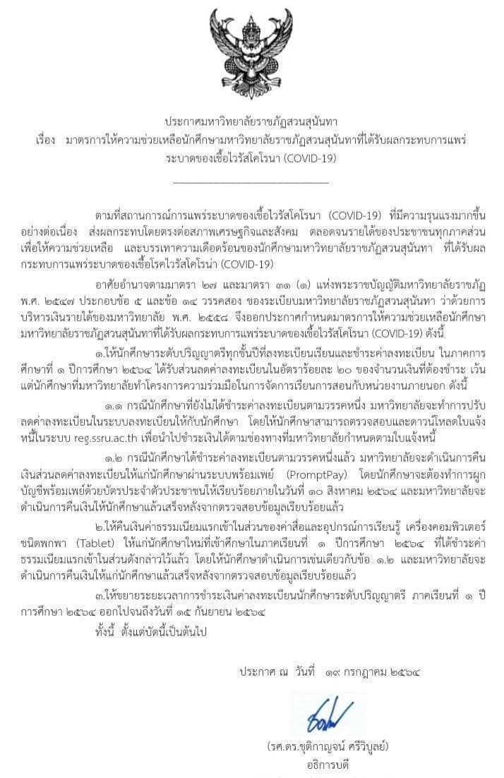 มหาวิทยาลัยราชภัฏสวนสุนันทา ประกาศมาตรการเยียวยาสู้วิกฤตโควิด-19 ดังนี้