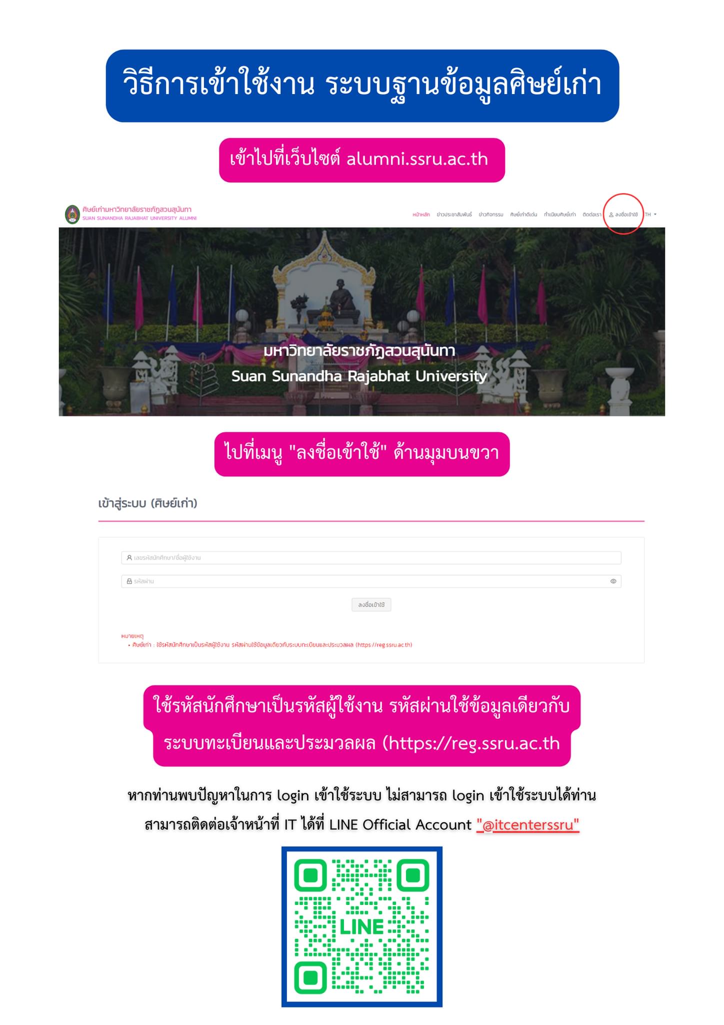 ขอเชิญชวนศิษย์เก่ามหาวิทยาลัยราชภัฏสวนสุนันทาทุกท่าน เข้าใช้งานระบบฐานข้อมูลศิษย์เก่า ที่ alumni.ssru.ac.th และทำการ Login เพื่อเข้าไปปรับปรุงข้อมูลส่วนบุคคล ตามรายละเอียดที่แจ้งไว้ กรณีที่พบปัญหาในการ Login เข้าระบบ ท่านสามารถติดต่อได้ที่ LINE Official Account "@itcenterssru"