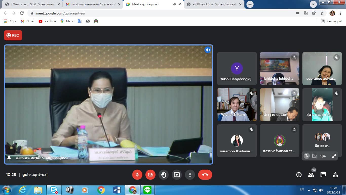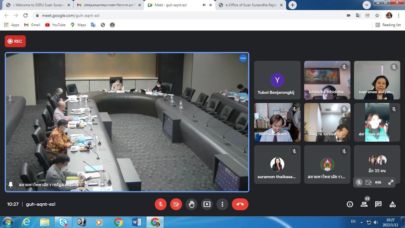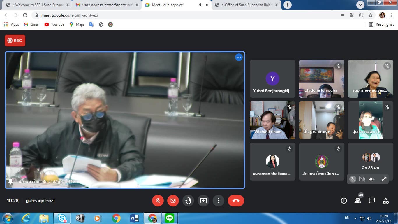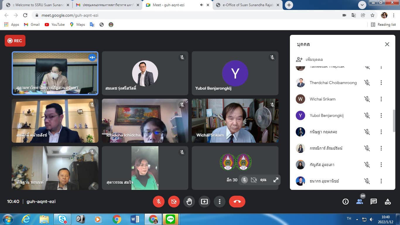 12 มกราคม 2565 รศ.ดร.บัณฑิต ผังนิรันดร์ คณบดีวิทยาลัยนวัตกรรมและการจัดการ เข้าร่วมการประชุมคณะกรรมการสภาวิชาการ มหาวิทยาลัยราชภัฏสวนสุนันทา ครั้งที่ 1/2565 โดยมี รศ.ดร.ชุติกาญจน์ ศรีวิบูลย์ อธิการบดีมหาวิทยาลัยราชภัฏสวนสุนันทา เป็นประธาน ณ ห้องประชุมสภามหาวิทยาลัย อาคาร 31 ชั้น 5 มหาวิทยาลัยราชภัฏสวนสุนันทา และประชุมผ่านระบบออนไลน์ (Google Meet)