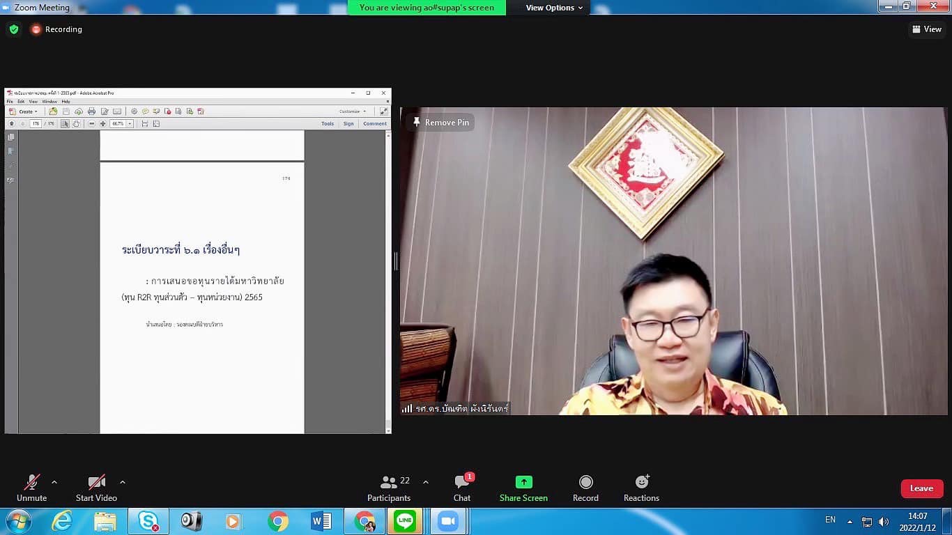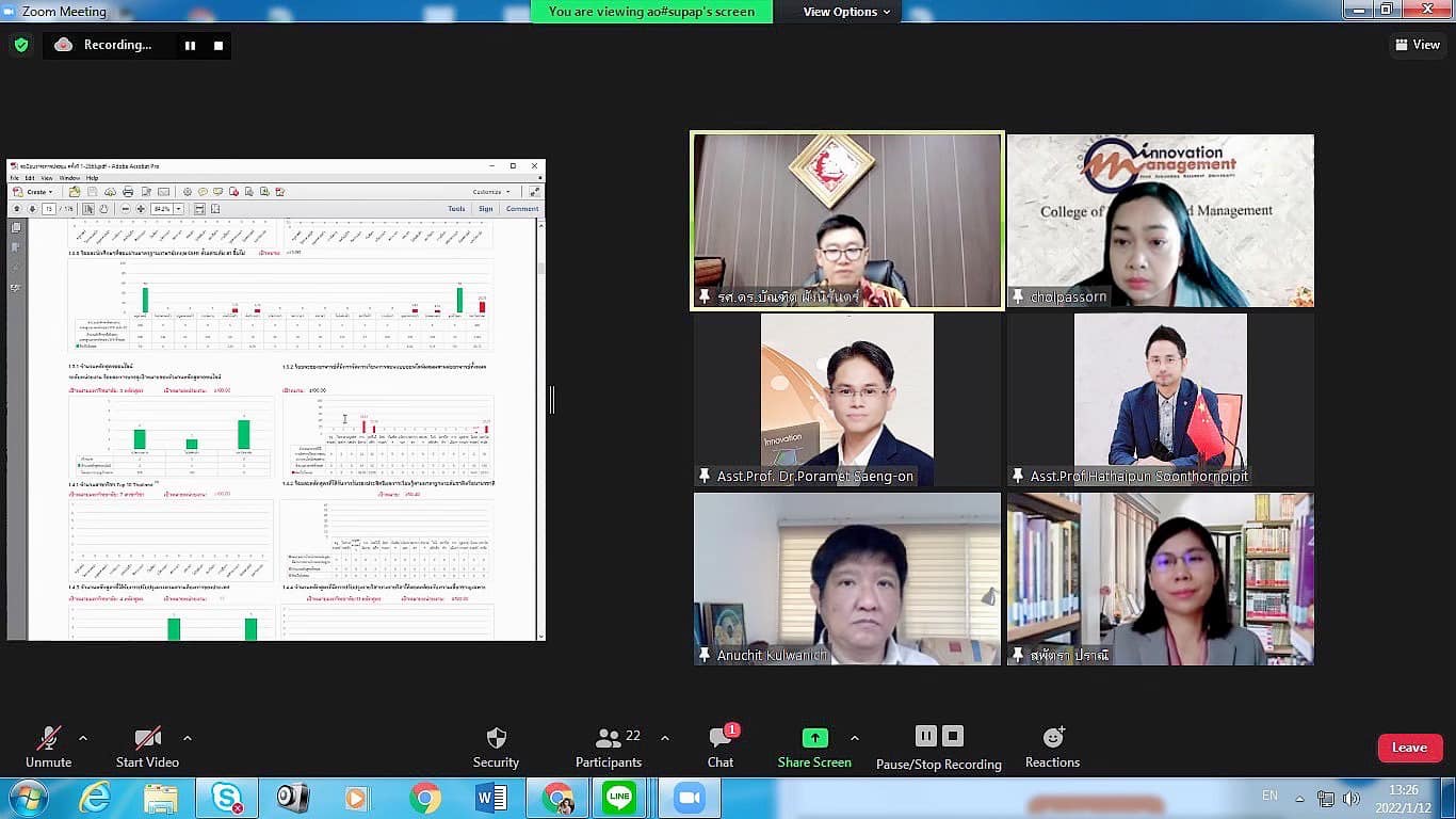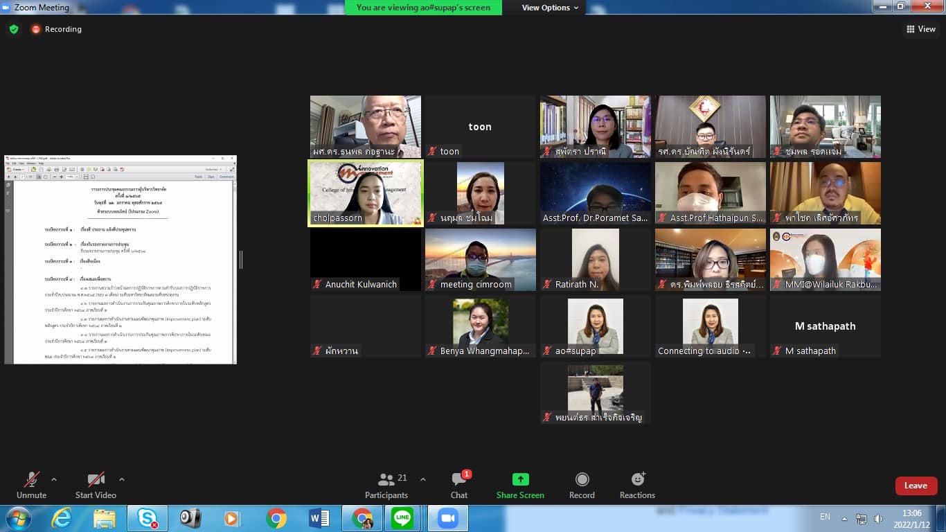 12 มกราคม 2564 วิทยาลัยนวัตกรรมและการจัดการ จัดประชุมคณะกรรมการผู้บริหารวิทยาลัย ครั้งที่ 1/2565 เพื่อขับเคลื่อนการดำเนินงานของวิทยาลัยให้มีประสิทธิภาพ โดยมี รองศาสตราจารย์ ดร.บัณฑิต ผังนิรันดร์ คณบดีวิทยาลัยนวัตกรรมและการจัดการ เป็นประธานการประชุม ผ่านระบบออนไลน์ Zoom meeting