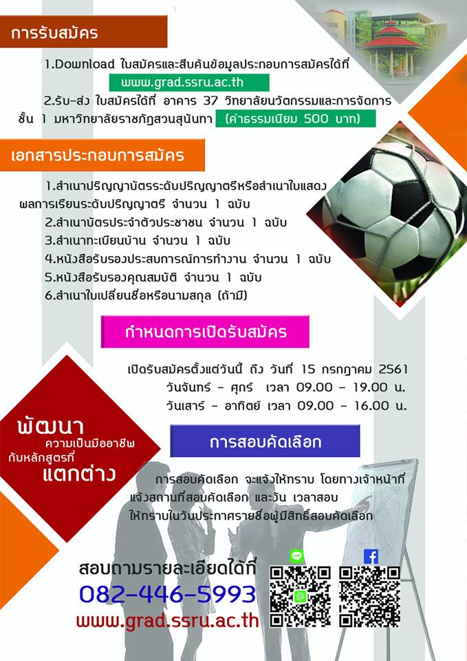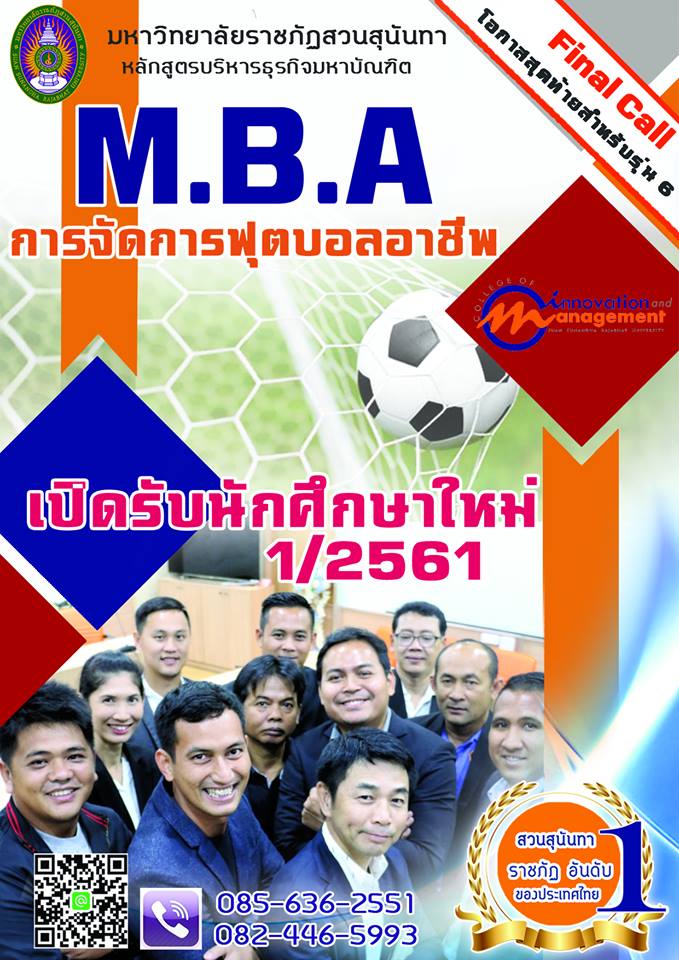 มหาวิทยาลัยราชภัฏสวนสุนันทา วิทยาลัยนวัตกรรมและการจัดการกำลังเปิดรับสมัครนักศึกษาปริญญาโท หลักสูตรบริหารธุรกิจมหาบัณฑิต สาขาการจัดการฟุตบอลอาชีพ