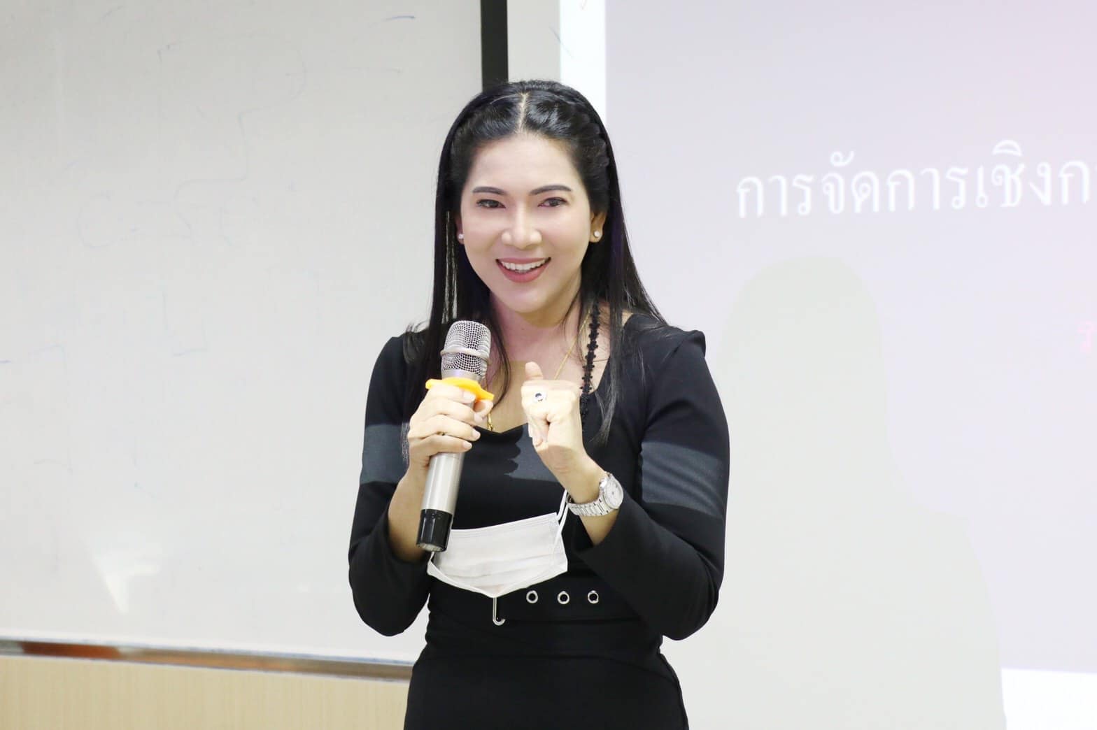 รองศาสตราจารย์ ดร.ชุติกาญจน์ ศรีวิบูลย์ รักษาราชการแทนอธิการบดีมหาวิทยาลัยราชภัฏสวนสุนันทา บรรยายให้ความรู้ในวิชาการจัดการเชิงกลยุทธ์ด้านทุนมนุษย์และองค์การ พร้อมให้ข้อคิด มุมมอง และทัศนคติ ในด้านการบริหารและการพัฒนาตนเองแก่นักศึกษา ทั้งนี้ ผู้เข้ารับฟังเป็นนักศึกษาภาคพิเศษจากบริษัท MK Restaurant จำกัด ณ ห้อง ๒๘๓๕ อาคารสมาคมชาวชัยนาท ชั้น ๓ | ![]() | ![]() | |