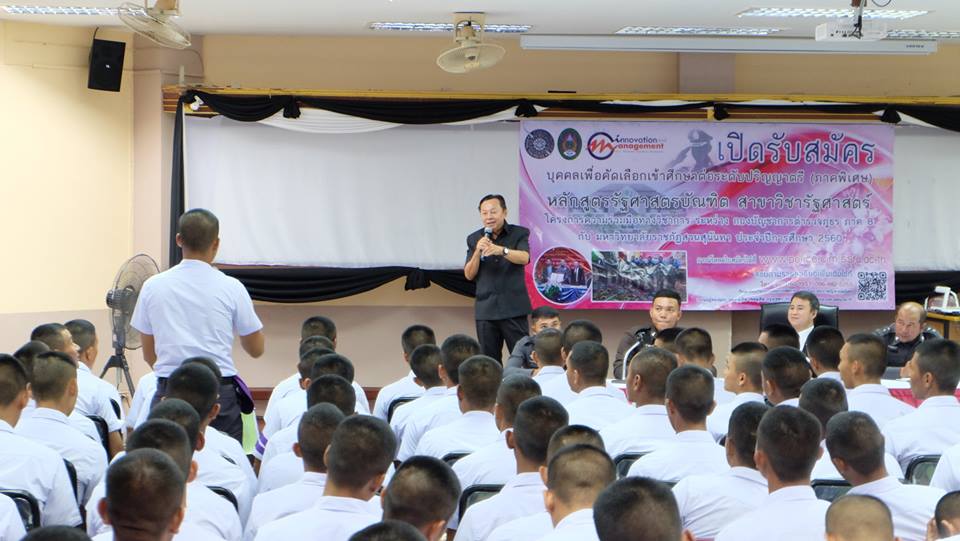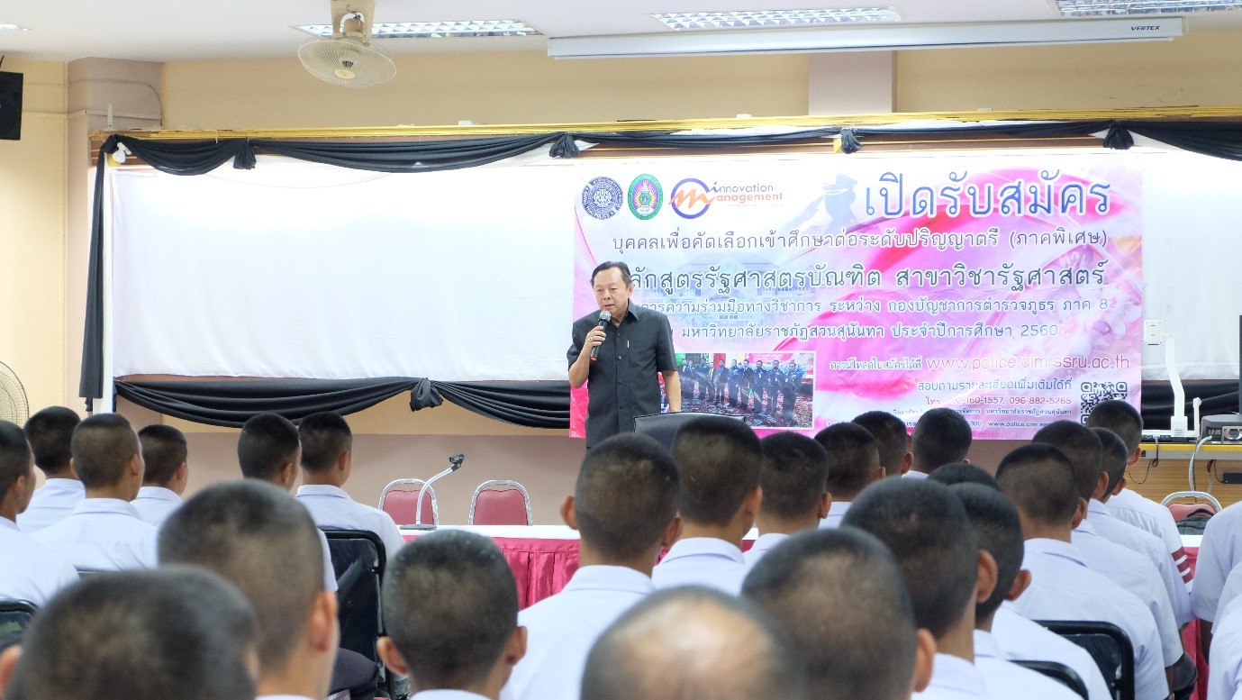 วันที่ 11-12 ตุลาคม 2560 พล.ต.ท.ดร.สัณฐาน ชยนนท์ ผู้อำนวยการหลักสูตรรัฐศาสตร์ ผศ.ดร.วิจิตร ศรีสอน ประธานหลักสูตรรัฐศาสตรมหาบัณฑิต พร้อมด้วยคณะ ได้เดินทางไปประชาสัมพันธ์หลักสูตรรัฐศาสตร์ ระดับปริญญาตรีและโท วิทยาลัยและนวัตกรรมและการจัดการ มหาวิทยาลัยราชภัฏสวนสุนันทา ณ ศูนย์ฝึกอบรมตำรวจภูธรภาค 8 จังหวัดสุราษฎร์ธานี และศูนย์ฝึกอบรมตำรวจภูธรภาค 9 จังหวัดยะลา โดยมีนักเรียนนายสิบตำรวจเข้าร่วมรับฟัง รวมจำนวนกว่า 796 คน