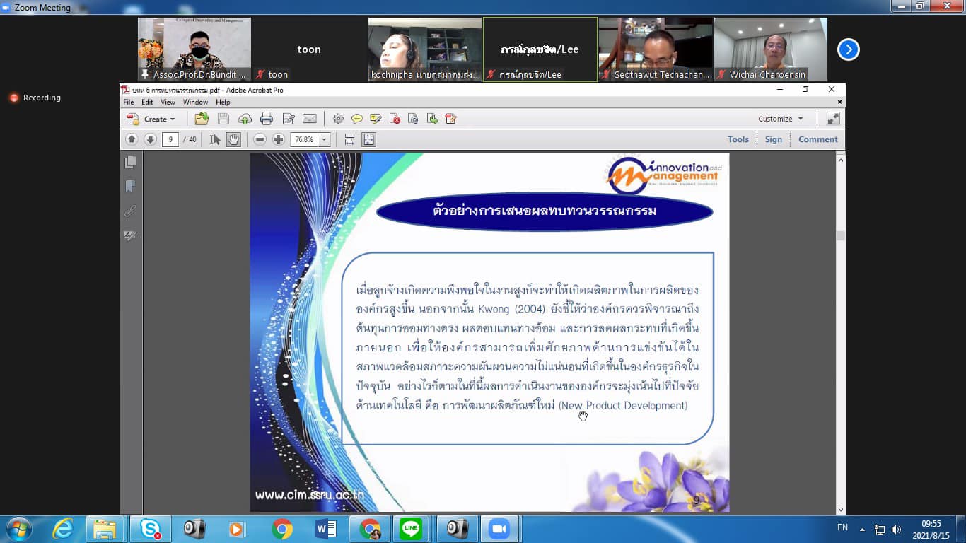 15 สิงหาคม 2564 รองศาสตราจารย์ ดร.บัณฑิต ผังนิรันดร์ คณบดีวิทยาลัยนวัตกรรมและการจัดการ ให้เกียรติมาเป็นอาจารย์ผู้สอน ในรายวิชาระเบียบวิธีวิจัยนวัตกรรมการจัดการขั้นสูง ให้กับนักศึกษาหลักสูตรปรัชญาดุษฏีบัณฑิต สาขานวัตกรรมและการจัดการ โดยสอนผ่านระบบออนไลน์ เนื่องจากสถานการณ์การแพร่ระบาดของเชื้อไวรัส โควิด - 19