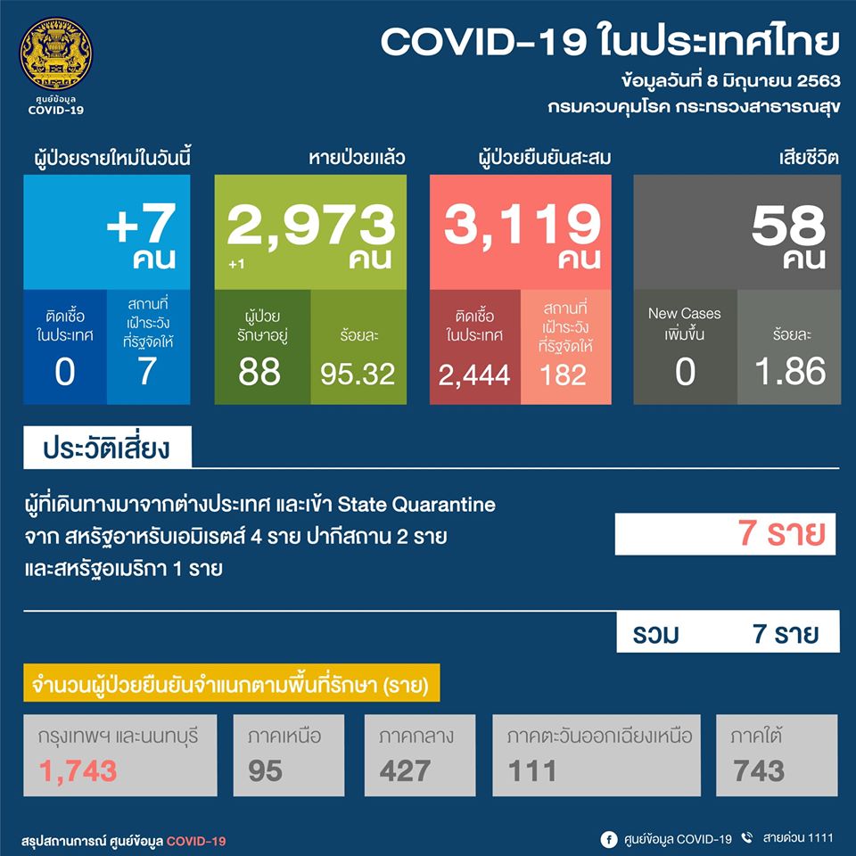 วันที่ 8 มิถุนายน 2563 เวลา 11.30 น. โฆษก ศบค. แถลงสถานการณ์การติดเชื้อ COVID-19 ผู้ป่วยรายใหม่ 7 ราย หายป่วยแล้ว 2,973 ราย ผู้ป่วยยืนยันสะสม 3,119 ราย เสียชีวิตสะสม 58 ราย