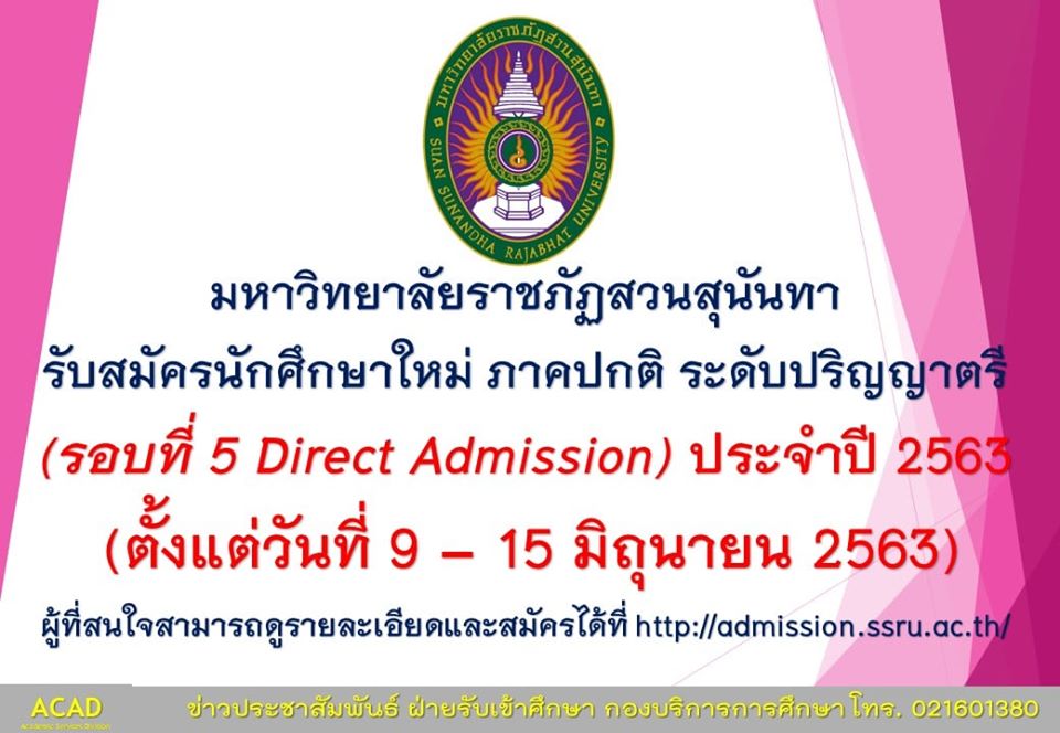 มหาวิทยาลัยราชภัฏสวนสุนันทา รับสมัครนักศึกษาใหม่ ภาคปกติ ระดับปริญญาตรี (รอบที่ 5 Direct Admission) ประจำปี 2563 (ตั้งแต่วันที่ 9 – 15 มิถุนายน 2563)