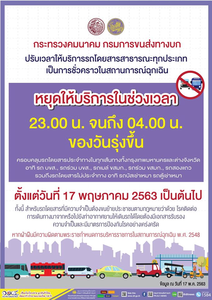 ตามที่มีประกาศข้อกำหนดออกความตามมาตรา 9 แห่งพระราชกำหนดการบริหารราชการในสถานการณ์ฉุกเฉิน พ.ศ. 2548 (ฉบับที่ 7) ผ่อนคลายการห้ามบุคคลทั่วราชอาณาจักรออกนอกเคหสถาน ระหว่างเวลา 23.00 - 04.00 น. มีผลตั้งแต่วันที่ 17 พฤษภาคม 2563 เป็นต้นไป กรมการขนส่งทางบก จึงได้ออกคำสั่งกรมการขนส่งทางบก เรื่อง ระงับการเดินรถโดยสารสาธารณะเป็นการชั่วคราว ตามประกาศสถานการณ์ฉุกเฉินในทุกท้องที่ทั่วราชอาณาจักร (ฉบับที่ 2) เพื่อปรับระยะเวลาห้ามรถโดยสารสาธารณะวิ่งให้บริการให้สอดคล้องตามข้อกำหนดฯ โดยให้หยุดให้บริการในช่วงเวลา 23.00 น. จนถึง 04.00 น. ของวันรุ่งขึ้น ตามประกาศข้อกำหนด ห้ามบุคคลออกนอกเคหสถาน ตั้งแต่วันที่ 17 พฤษภาคม 2563 เป็นต้นไป ซึ่งครอบคลุมรถโดยสารประจำทางในทุกเส้นทางทั้งกรุงเทพมหานครและต่างจังหวัด อาทิ รถ บขส., รถร่วม บขส., รถเมล์ ขสมก., รถร่วม ขสมก., รถสองแถว รวมถึงรถโดยสารไม่ประจำทาง อาทิ รถบัสเช่าเหมา รถตู้เช่าเหมา โดยผู้ประกอบการขนส่งต้องพิจารณาการเดินรถให้ผู้โดยสารและผู้ประจำรถสามารถกลับถึงที่พักหรือจุดหมายได้ก่อนเวลาตามประกาศข้อกำหนดห้ามบุคคลออกนอกเคหสถานด้วย ในส่วนของรถแท็กซี่ , รถจักรยานยนต์รับจ้าง , รถสามล้อรับจ้าง (รถตุ๊กตุ๊ก), รถสี่ล้อเล็ก ให้ถือปฏิบัติตามข้อกำหนด ห้ามบุคคลออกนอกเคหสถานด้วยเช่นกัน ทั้งนี้ สำหรับรถโดยสารที่มีความจำเป็นต้องขนย้ายประชาชนตามกฎหมายว่าด้วยโรคติดต่อ การเดินทางมาจากหรือไปยังท่าอากาศยานให้เดินรถได้โดยต้องมีเอกสารรับรองความจำเป็นและมีมาตรการป้องกันโรคอย่างเคร่งครัด หากพบการฝ่าฝืนมีความผิดตามพระราชกำหนดการบริหารราชการในสถานการณ์ฉุกเฉิน พ.ศ. 2548