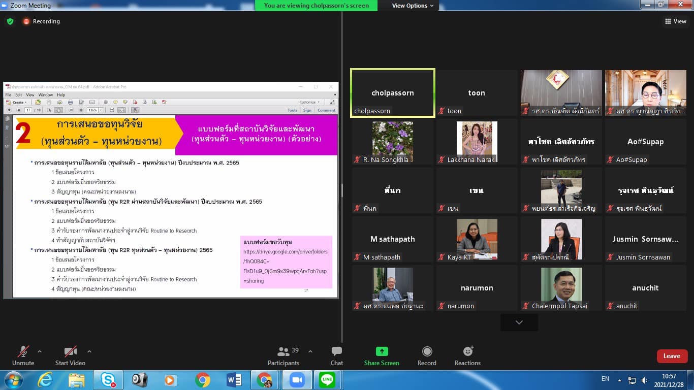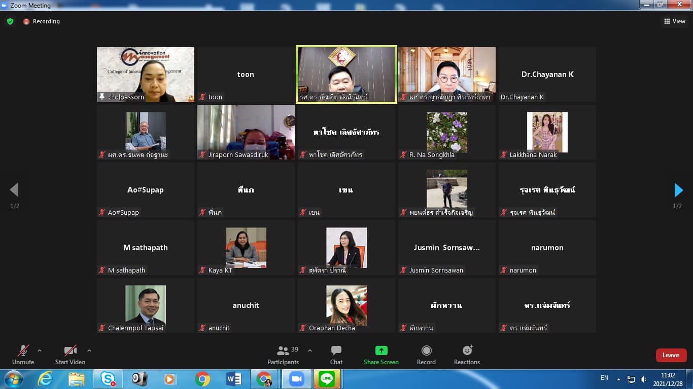 วันอังคารที่ 28 ธันวาคม 2564 วิทยาลัยนวัตกรรมและการจัดการ ประชุมชี้แจงแนวทางการขอทุนอุดหนุนโครงการวิจัย (ทุนส่วนตัว/ทุนหน่วยงาน) สำหรับสายวิชาการและสายสนับสนุนวิชาการ ประจำปี 2565 โดยมี รองศาสตราจารย์ ดร. บัณฑิตผังนิรันดร์ คณบดีวิทยาลัยนวัตกรรมและการจัดการ เป็นประธาน ผ่านระบบ ZOOM