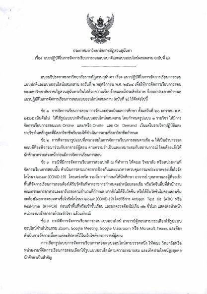 แจ้งนักศึกษาวิทยาลัยนวัตกรรมและการจัดการ ระดับปริญญาตรีภาคปกติและภาคพิเศษ ****ประกาศมหาวิทยาลัยราชภัฏสวนสุนันทา เรื่อง แนวปฏิบัติในการจัดการเรียนการสอนแบบปกติและแบบออนไลน์ผสมผสาน (ฉบับที่ 2) ประกาศ ณ วันที่ 7 มกราคม 2565