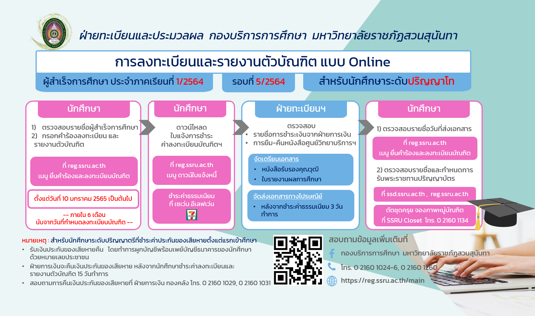 แจ้งนักศึกษาวิทยาลัยนวัตกรรมและการจัดการ ระดับปริญญาตรี ภาคปกติและภาคพิเศษ เรื่อง*การลงทะเบียนและรายงานตัวบัณฑิต เพื่อรับเอกสารสำคัญทางการศึกษา ประจำปีการศึกษา 2564 รอบที่ 5/2564 สำหรับนักศึกษาระดับปริญญาโท ที่ reg.ssru.ac.th ***