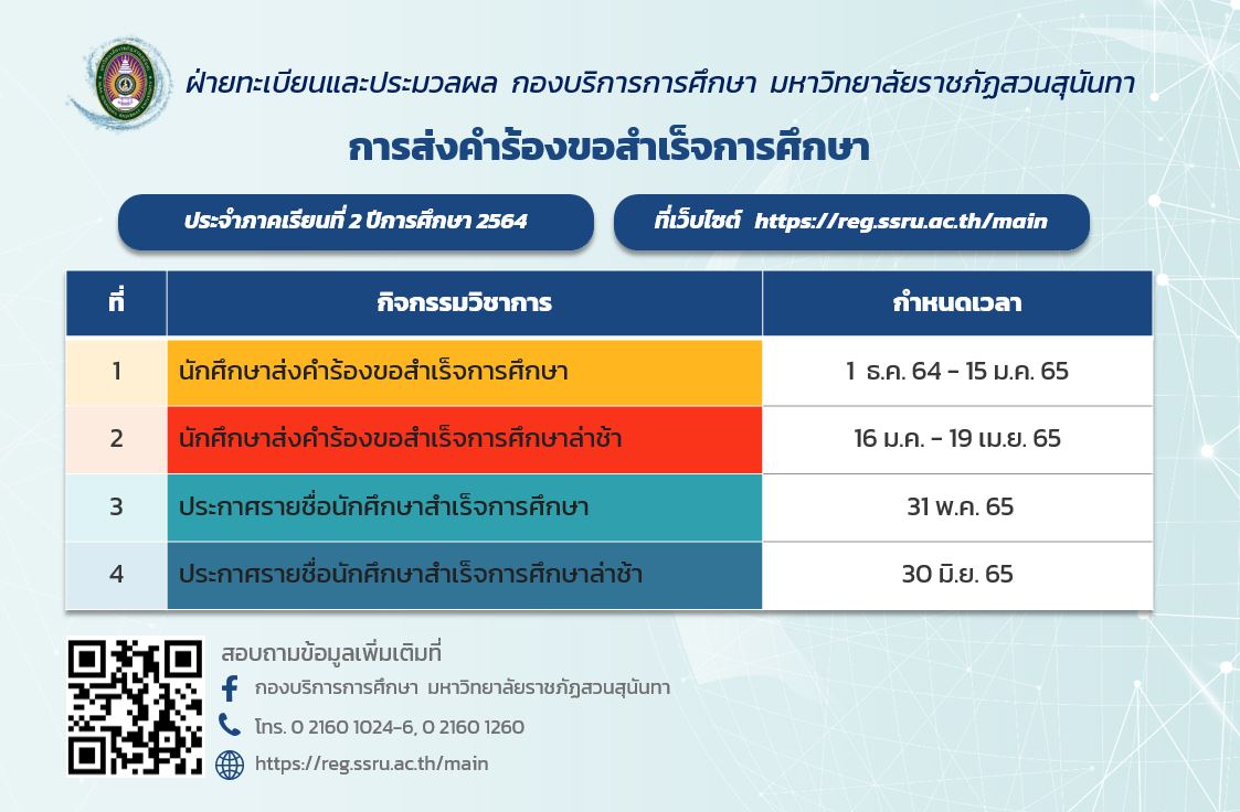 ***การส่งคำร้องขอสำเร็จการศึกษา ประจำภาคเรียนที่ 2 ปีการศึกษา 2564 ที่ reg.ssru.ac.th