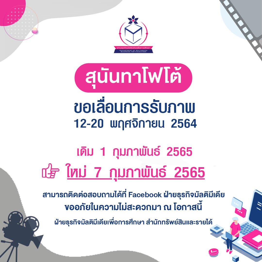 แจ้งนักศึกษา วิทยาลัยนวัตกรรมและการจัดการ เนื่องจากสุนันทาโฟโต้ ขอเลื่อนการรับภาพถ่าย สำหรับนักศึกษาที่มาถ่ายภาพ ระหว่างวันที่ 12 - 20 พฤศจิกายน 2564