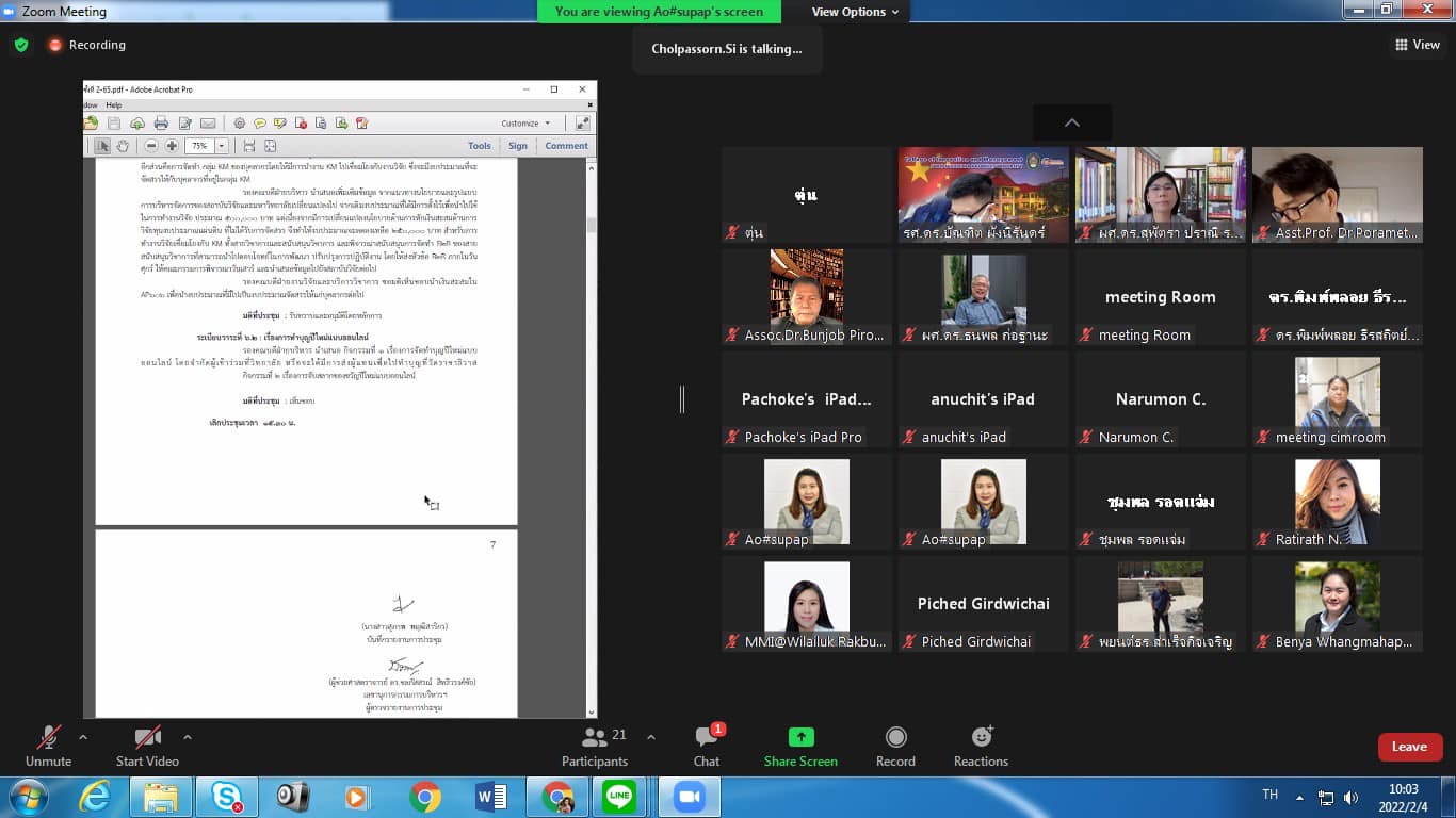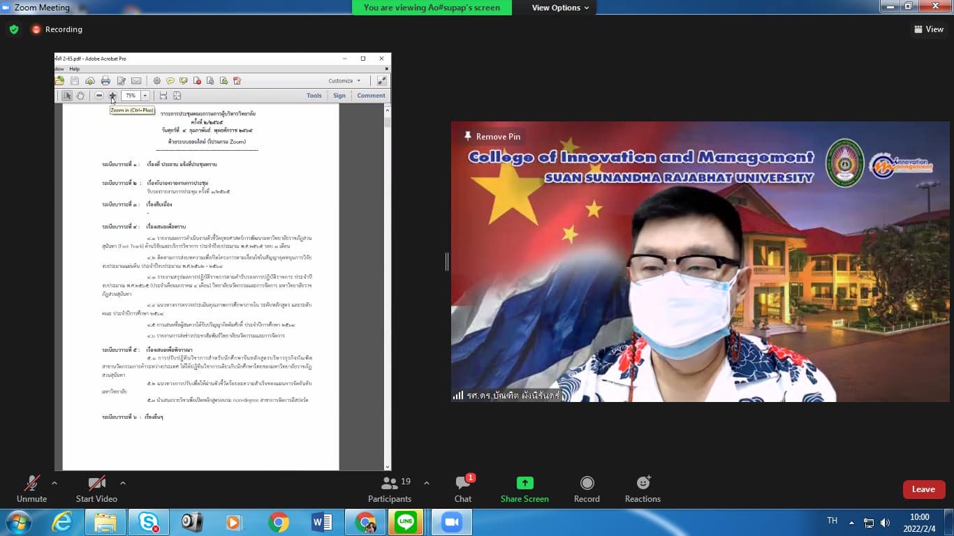 วันศุกร์ ที่ 4 กุมภาพันธ์ 2565 วิทยาลัยนวัตกรรมและการจัดการ จัดประชุมคณะผู้บริหาร เพื่อขับเคลื่อนการดำเนินงานของวิทยาลัยให้มีประสิทธิภาพในทุกๆด้านๆและทุกๆฝ่าย โดยมี รองศาสตราจารย์ ดร.บัณฑิต ผังนิรันดร์ คณบดีวิทยาลัยนวัตกรรมและการจัดการ เป็นประธานการประชุม ผ่านระบบออนไลน์ Zoom meeting