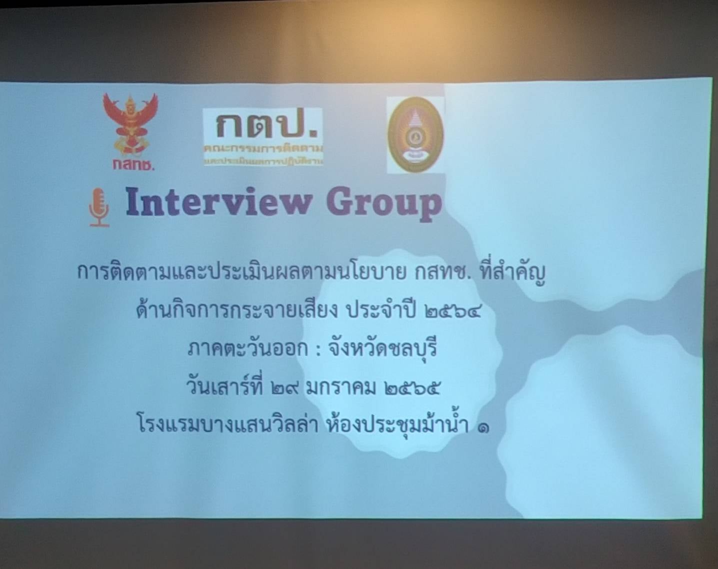 มหาวิทยาลัยราชภัฏสวนสุนันทาได้รับมอบหมายจากสำนักงานคณะกรรมการกิจการกระจายเสียง กิจการโทรทัศน์ และกิจการโทรคมนาคมแห่งชาติ (กสทช.) ให้เป็นที่ปรึกษาเพื่อติดตามและประเมินผลตามนโยบาย กสทช. ที่สำคัญด้านกิจการกระจายเสียง ประจำปี 2564 จึงได้เชิญสื่อวิทยุ ประชาสัมพันธ์จังหวัด นักวิชาการ เข้าร่วมประชุมสัมภาษณ์กลุ่มย่อย (Interview Group) การติดตามและประเมินผลตามนโยบาย กสทช .ที่สำคัญด้านกิจการกระจายเสียง โดยมีผู้ช่วยศาสตราจารย์ ดร.ปรเมษฐ์ แสงอ่อน เป็นหัวหน้าโครงการ และรองศาสตราจารย์ดร. กัญญามน กาญจนาทวีกูล ดร.วัลลภ ศรีทองพิมพ์ ดร.วรรณพร พุทธภูมิพิทักษ์ และอาจารย์อิสรา วันดี เป็นผู้ดำเนินการสัมภาษณ์กลุ่มย่อย ภาคตะวันออก : จังหวัดชลบุรี ณ ห้องประชุมม้าน้ำ 1 โรงแรมบางแสนวิลล่า ในวันเสาร์ที่ 29 มกราคม 2565